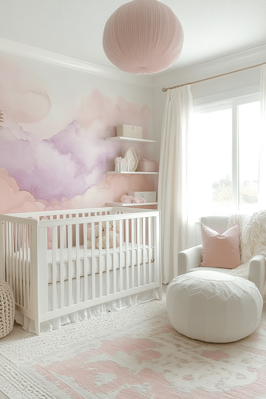 Muted mauve shades introduce baby room inspiration with a dreamy, modern softness. The color adds whimsy while remaining gentle. Smooth shapes and white accents enhance the airy feel. The space feels light and imaginative. Ideal for quiet play and rest.
