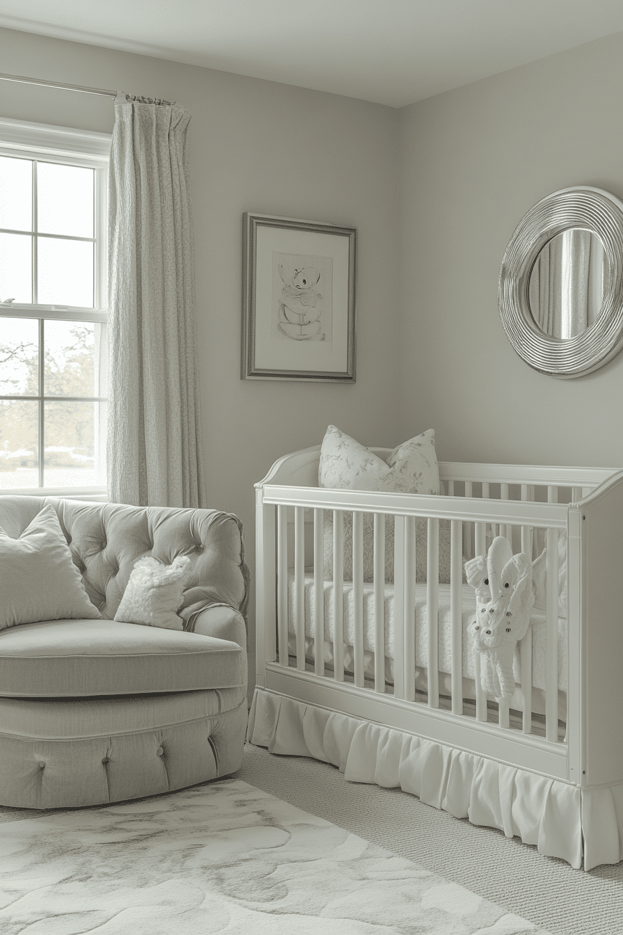 Soft gray tones paired with subtle silvery details create baby room inspiration that feels refined, calm, and quietly elegant. Gentle metallic touches add depth without distraction. Plush textiles soften the overall look. The room feels sophisticated while remaining baby-friendly. This style suits modern yet gentle spaces.