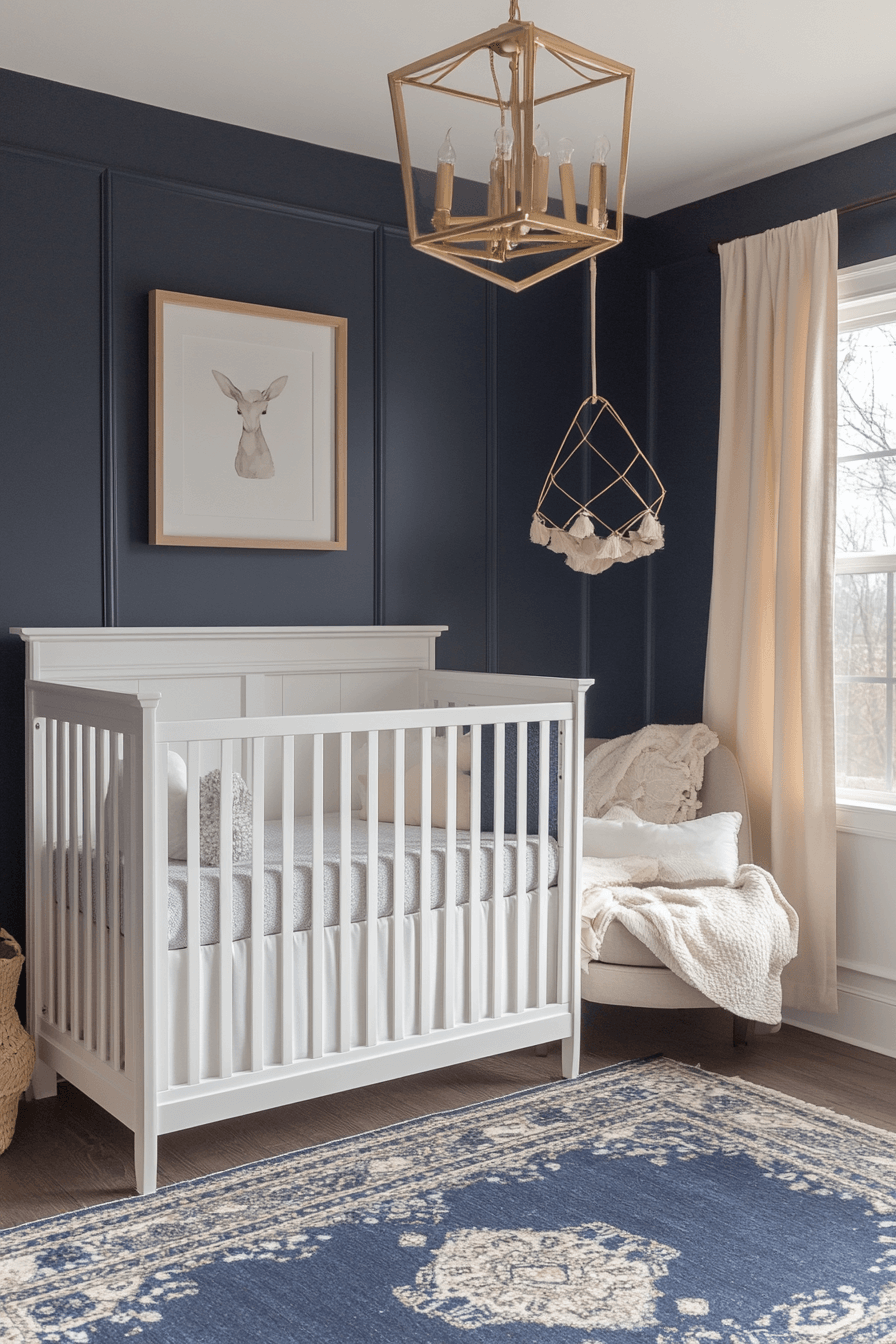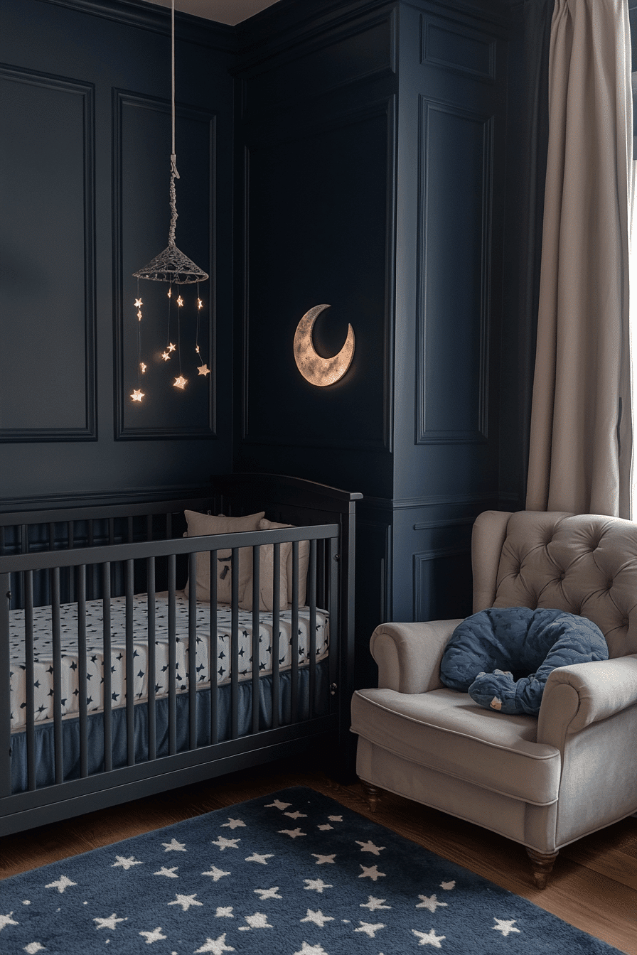 Deep navy tones shape baby room inspiration that feels protective, cozy, and grounding. The darker palette creates a cocoon-like atmosphere ideal for rest. Light accents prevent heaviness and maintain balance. The room feels secure and calming. This style supports bedtime routines beautifully.