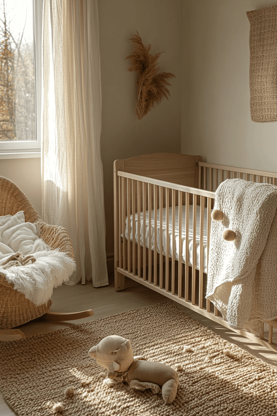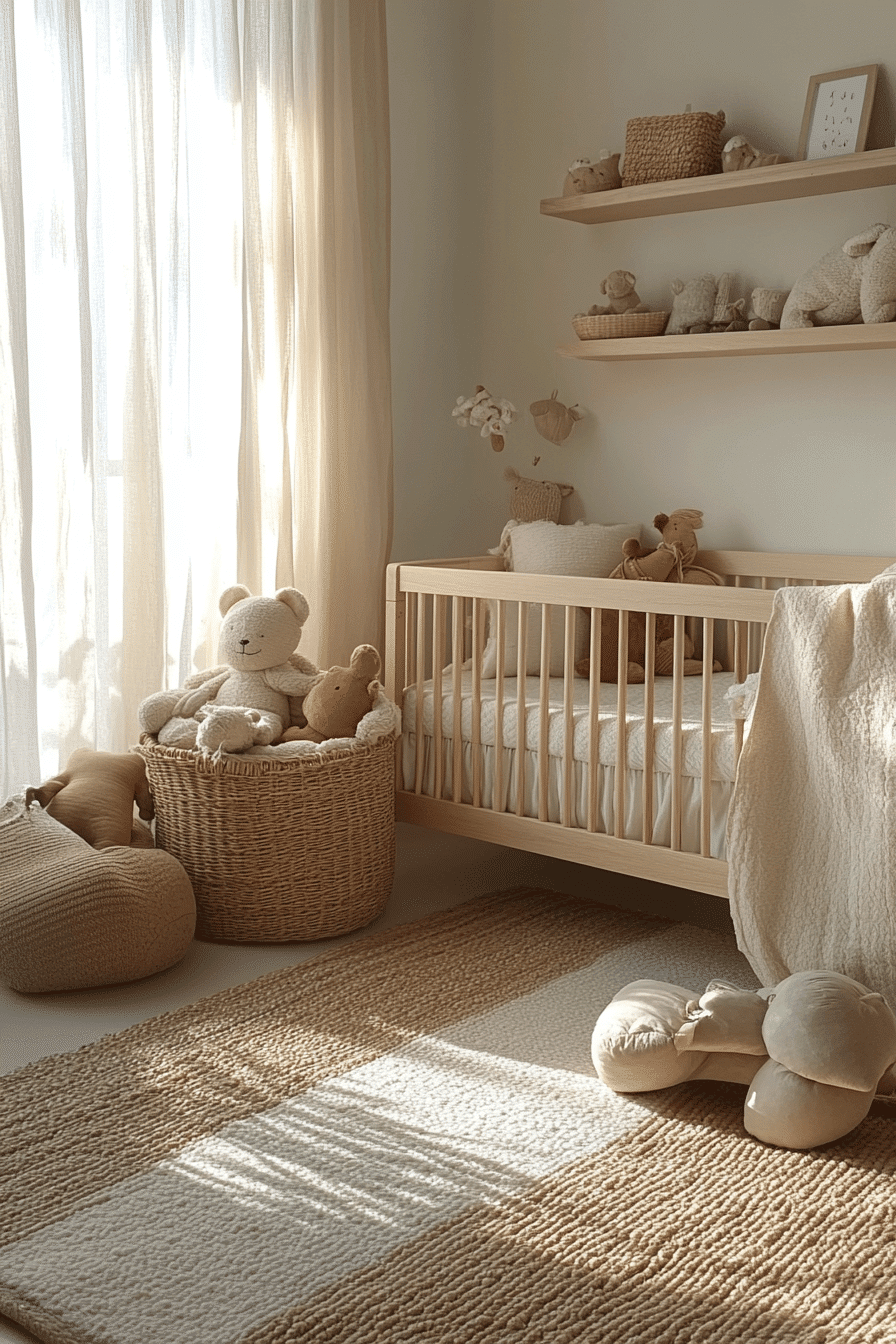 Honey-toned beige hues create baby room inspiration that feels warm, grounding, and emotionally soothing. Layered fabrics add depth and softness. The palette promotes calm and closeness. The room feels nurturing and steady. This style supports quiet bonding moments.