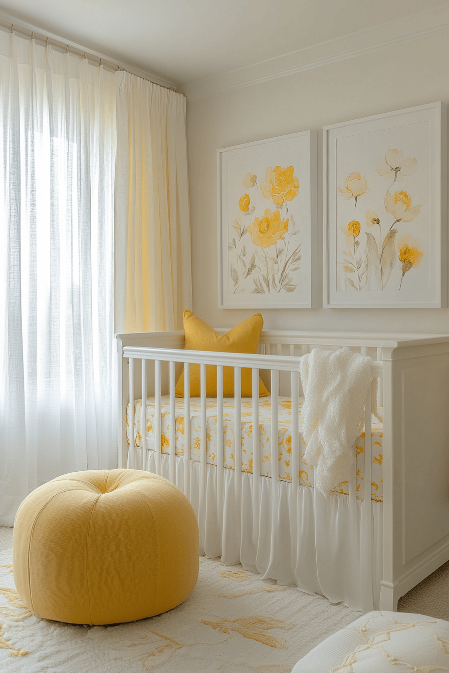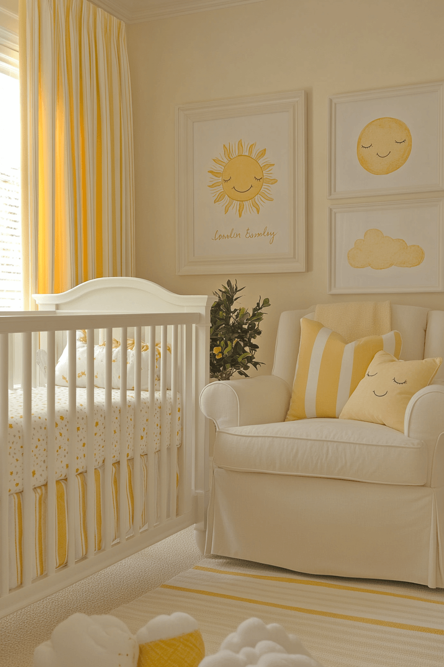 Soft yellow details bring baby room inspiration filled with gentle happiness and optimism. The palette remains soft on the eyes while uplifting the mood. White furnishings keep balance and brightness. The room feels joyful yet calm. This nursery supports positive energy year-round.