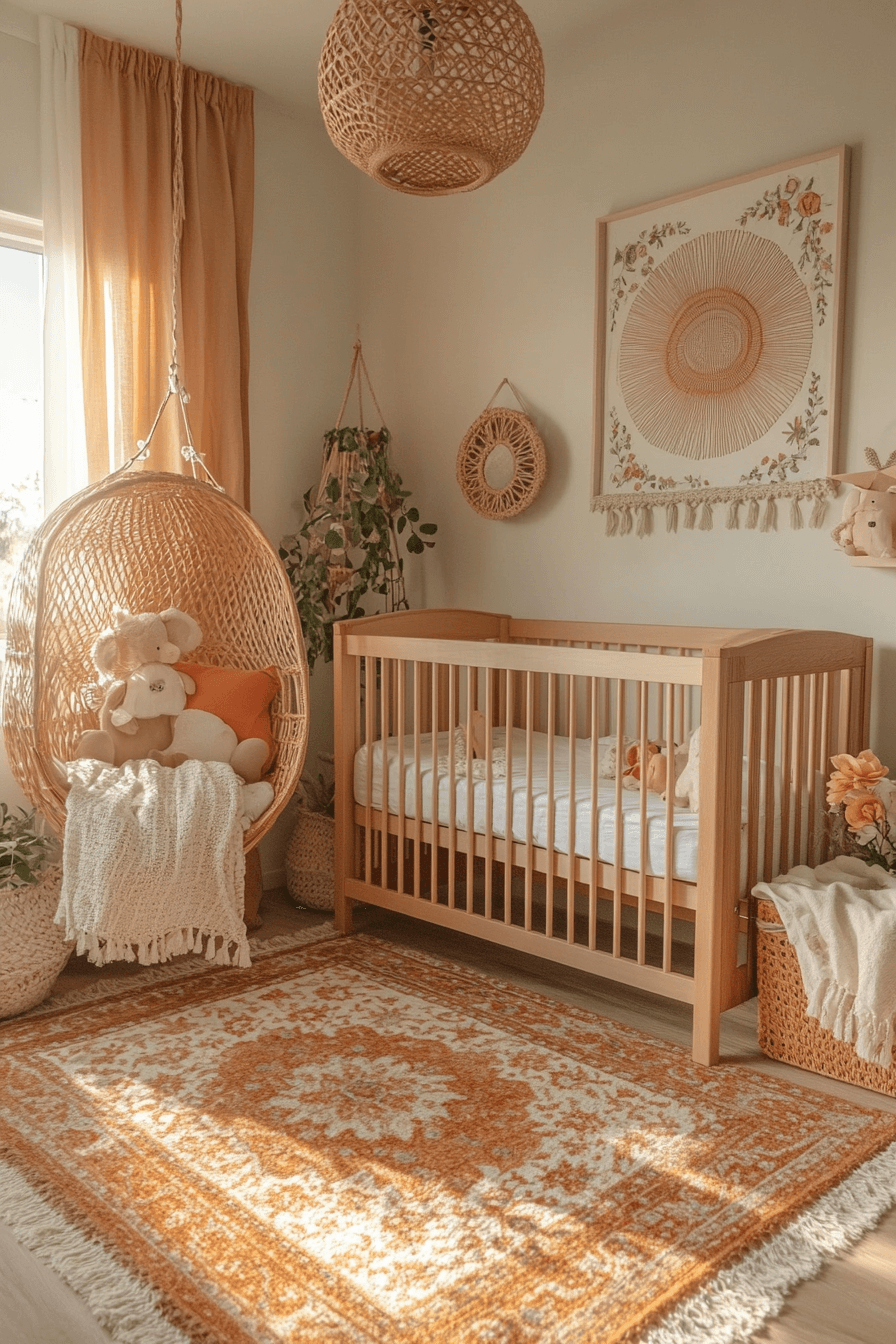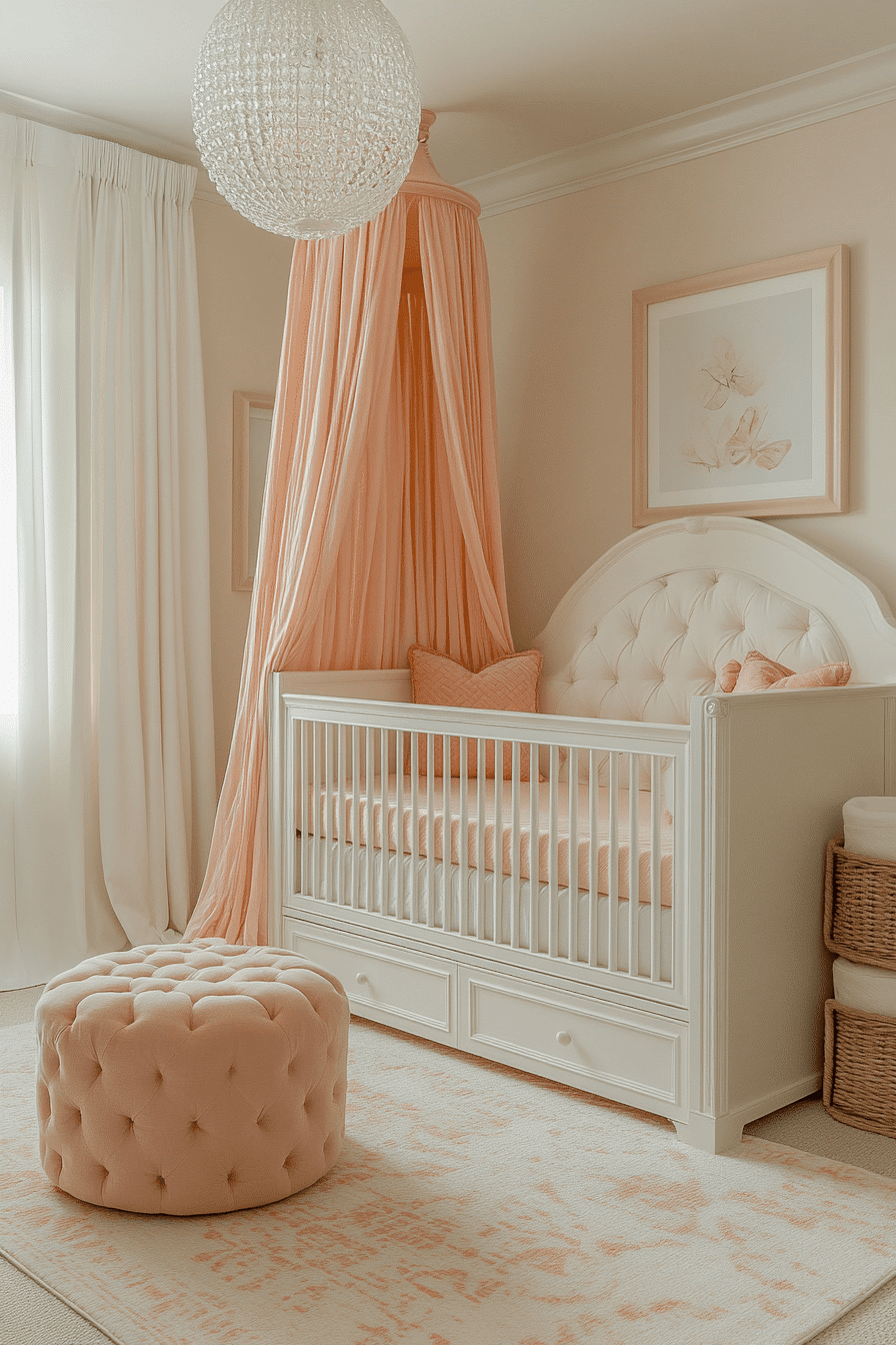 Soft peach and coral undertones create baby room inspiration that feels warm, affectionate, and softly glowing. The palette brings gentle color without overpowering the senses. Earthy accents and diffused lighting enhance the inviting mood. The room feels comforting and expressive. This style supports connection and cozy routines.
