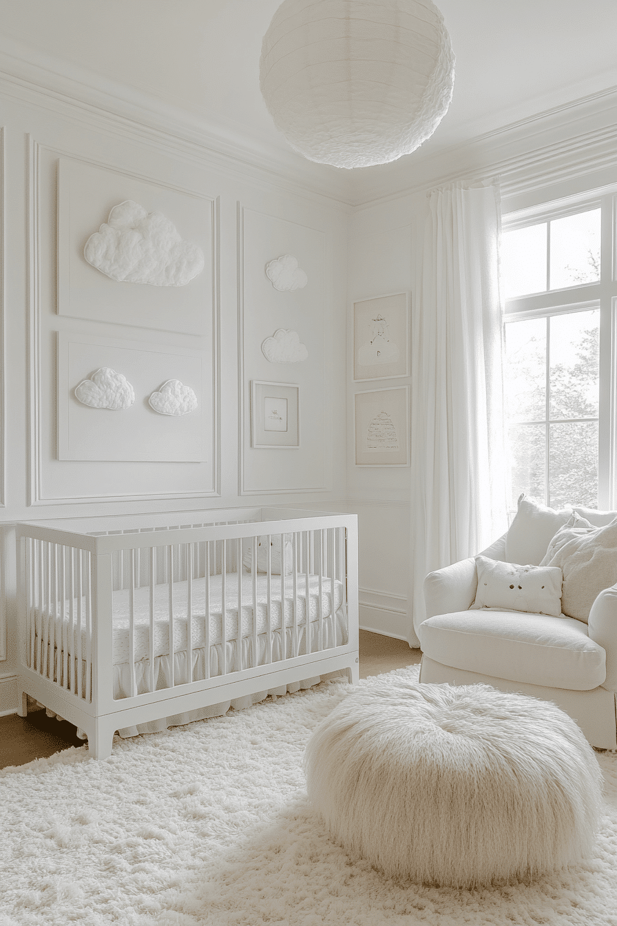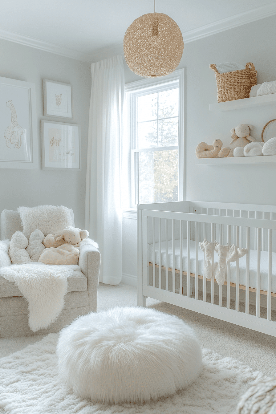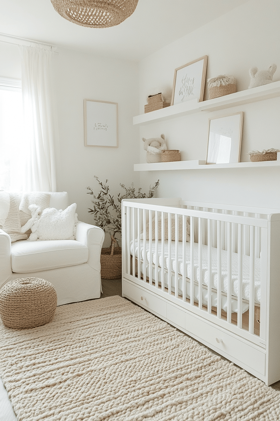 Soft white tones layered with tactile textures create baby room inspiration that feels serene, elegant, and comforting. The palette enhances natural light while remaining gentle. Thoughtful decor softens the brightness. The room feels peaceful and sweet. Ideal for minimalist homes.