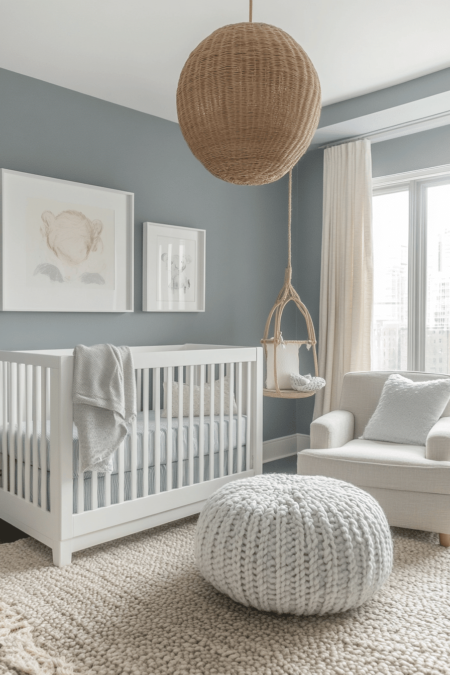 Muted gray-blue hues shape baby room inspiration that feels composed, calming, and quietly structured. The tone offers stability without harshness. Soft fabrics maintain comfort throughout the space. The room feels serene and balanced. Ideal for restful routines.