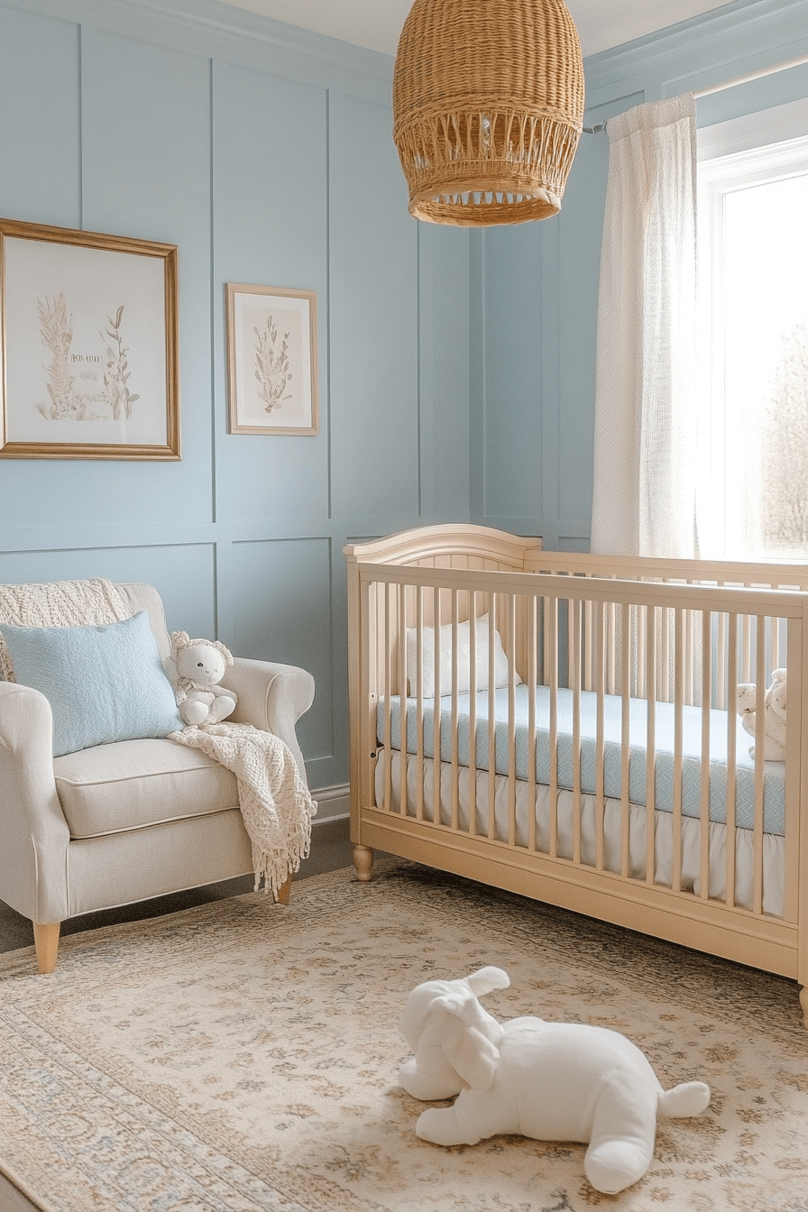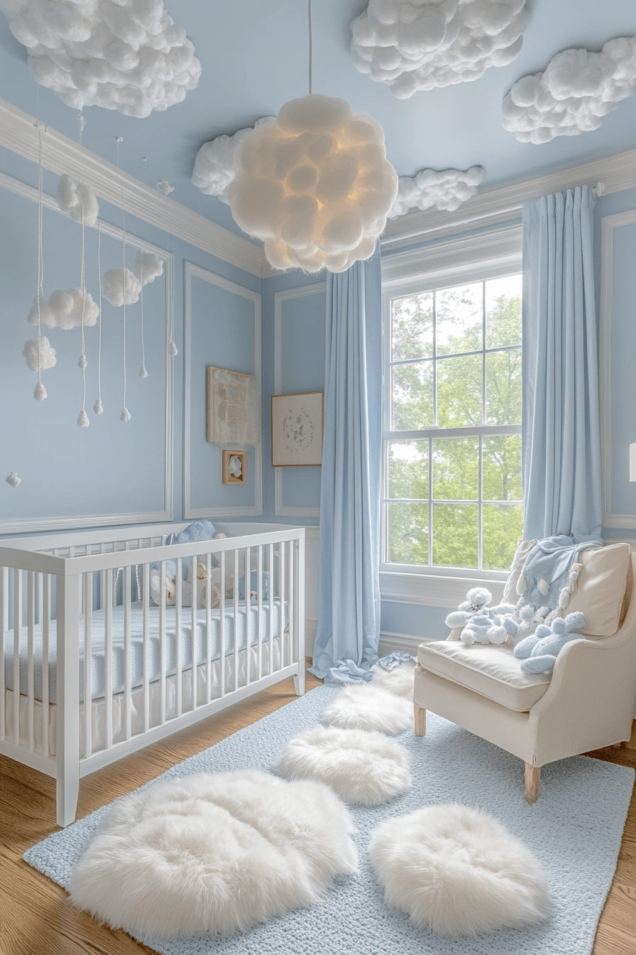 Soft sky-blue tones paired with fluffy white accents offer baby room inspiration that feels open, calming, and emotionally light. The palette mimics open skies, creating a sense of peace throughout the space. Gentle decorative elements add whimsy while maintaining simplicity. The room feels comforting for both baby and parent. This style supports relaxation and joy.