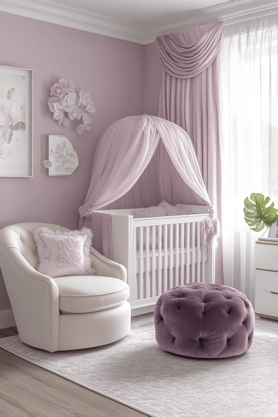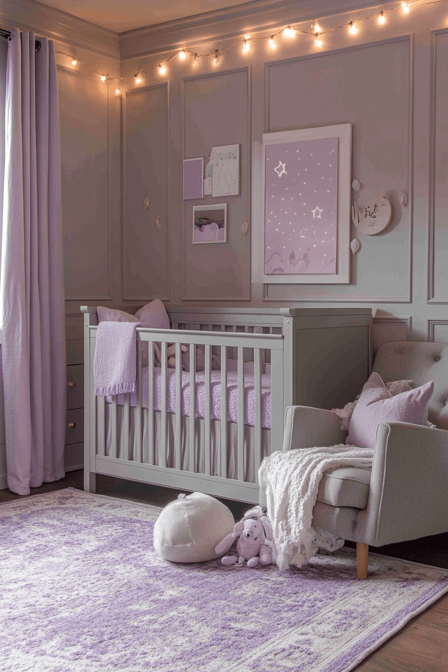 Muted lavender tones bring baby room inspiration that feels dreamy, delicate, and soothing to the senses. The gentle purple shade supports relaxation while adding subtle personality. Natural fabrics soften the room and enhance comfort. The palette feels peaceful without visual noise. This nursery style supports calm routines and restful sleep.