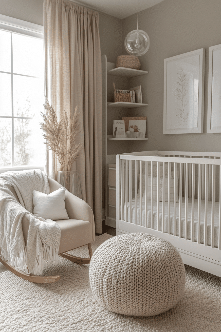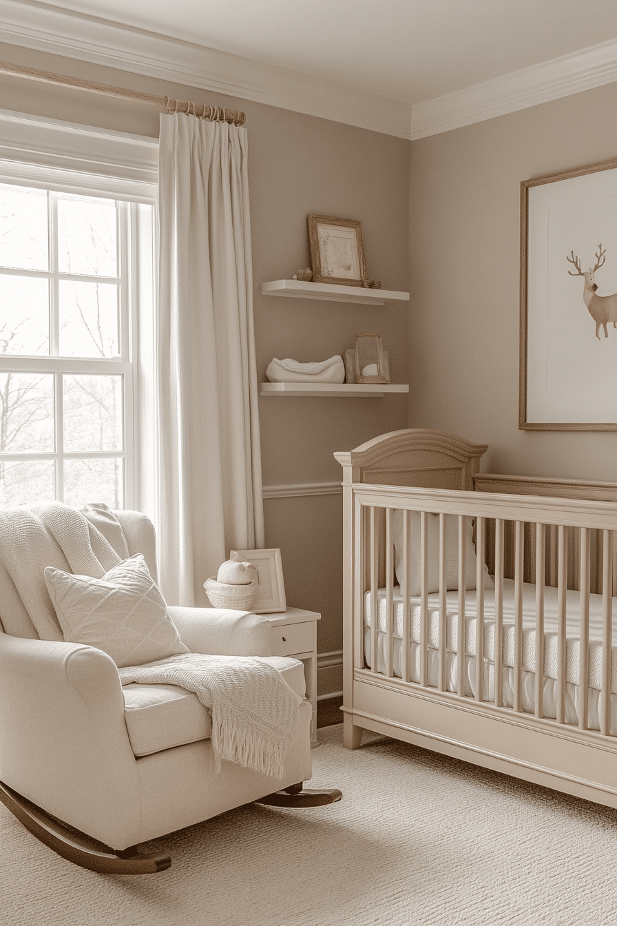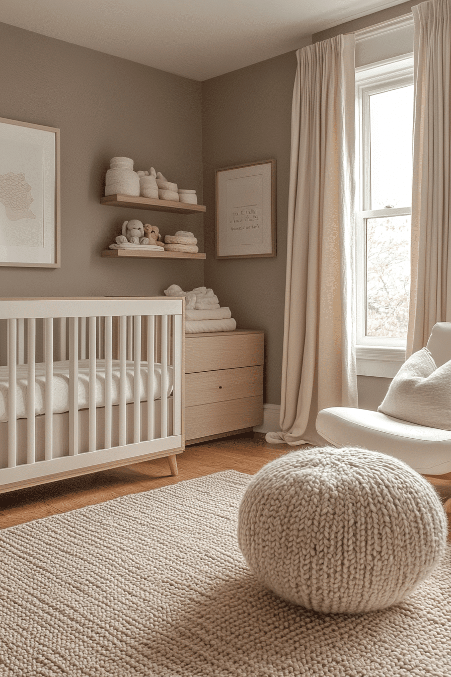 Soft taupe tones layered with matte finishes create a neutral baby nursery that feels cocoon-like and serene. The palette adds depth while remaining understated. Minimal decor keeps the environment visually quiet. Plush seating enhances comfort for long feeding or rocking moments. This nursery style feels elegant and restful.