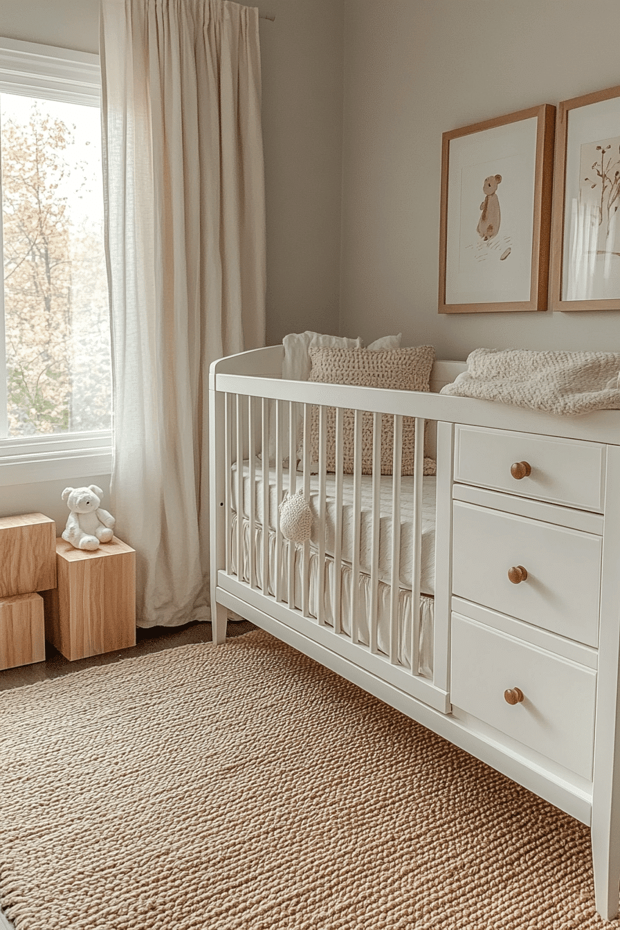 Soft beige tones paired with crisp white accents create a neutral baby nursery that feels light, airy, and emotionally soothing. The palette encourages calm while maintaining brightness throughout the room. Rounded furniture edges and simple silhouettes add a dreamy softness. This design works effortlessly for any gender and evolves beautifully over time. Cozy textures complete the balanced look.