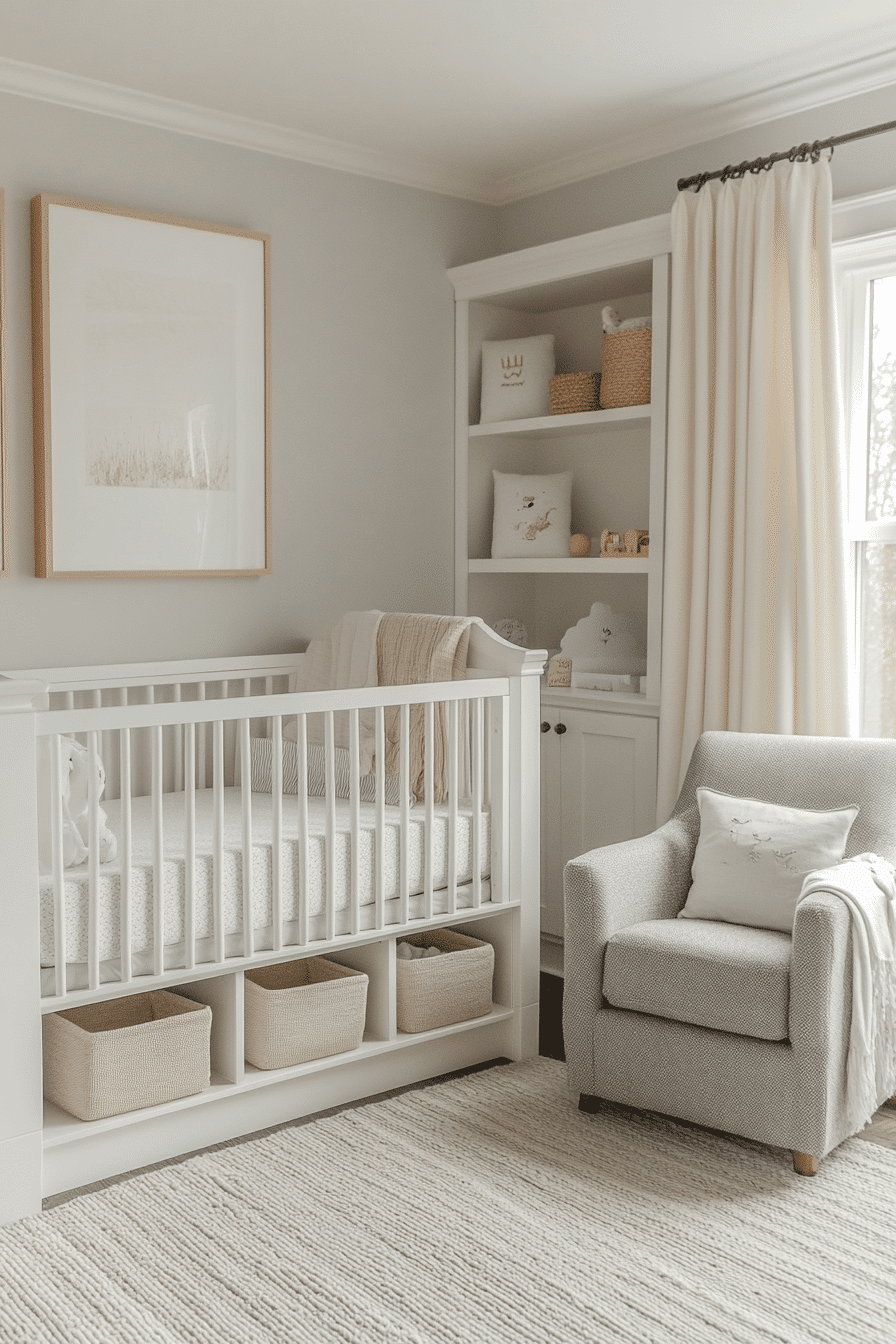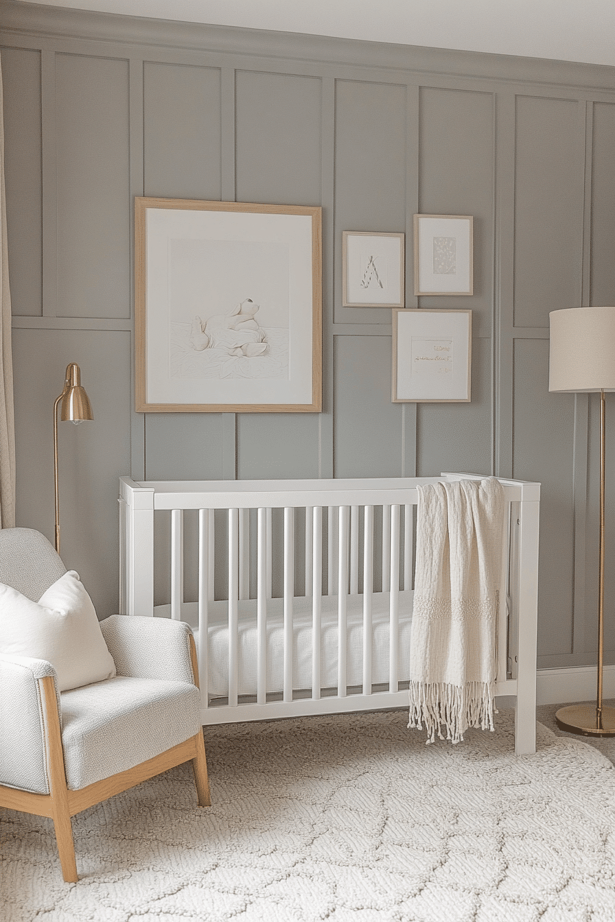 Cool gray tones inspired by smooth stone shape a neutral baby nursery that feels calm, composed, and quietly elegant. The palette provides structure while remaining light and breathable. It pairs effortlessly with white textiles and pale wood details. Clean lines and thoughtful storage enhance the peaceful layout. This look feels refined yet gentle.
