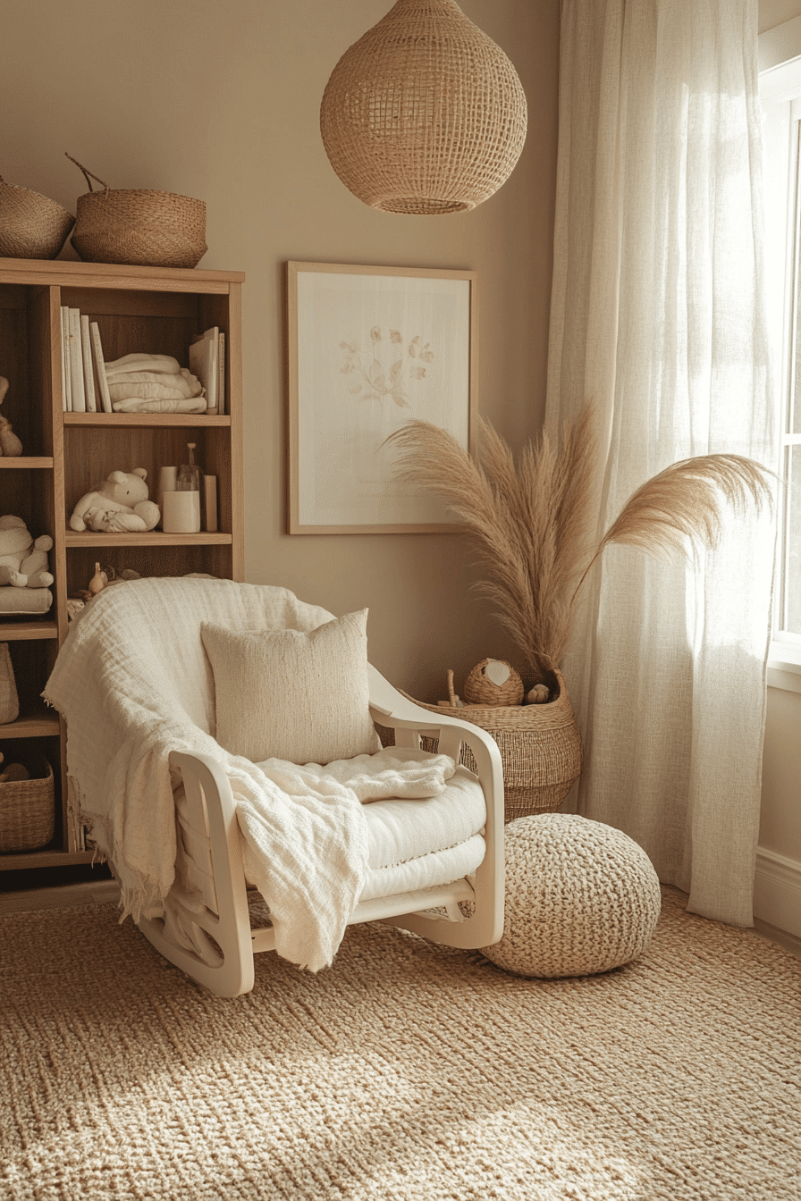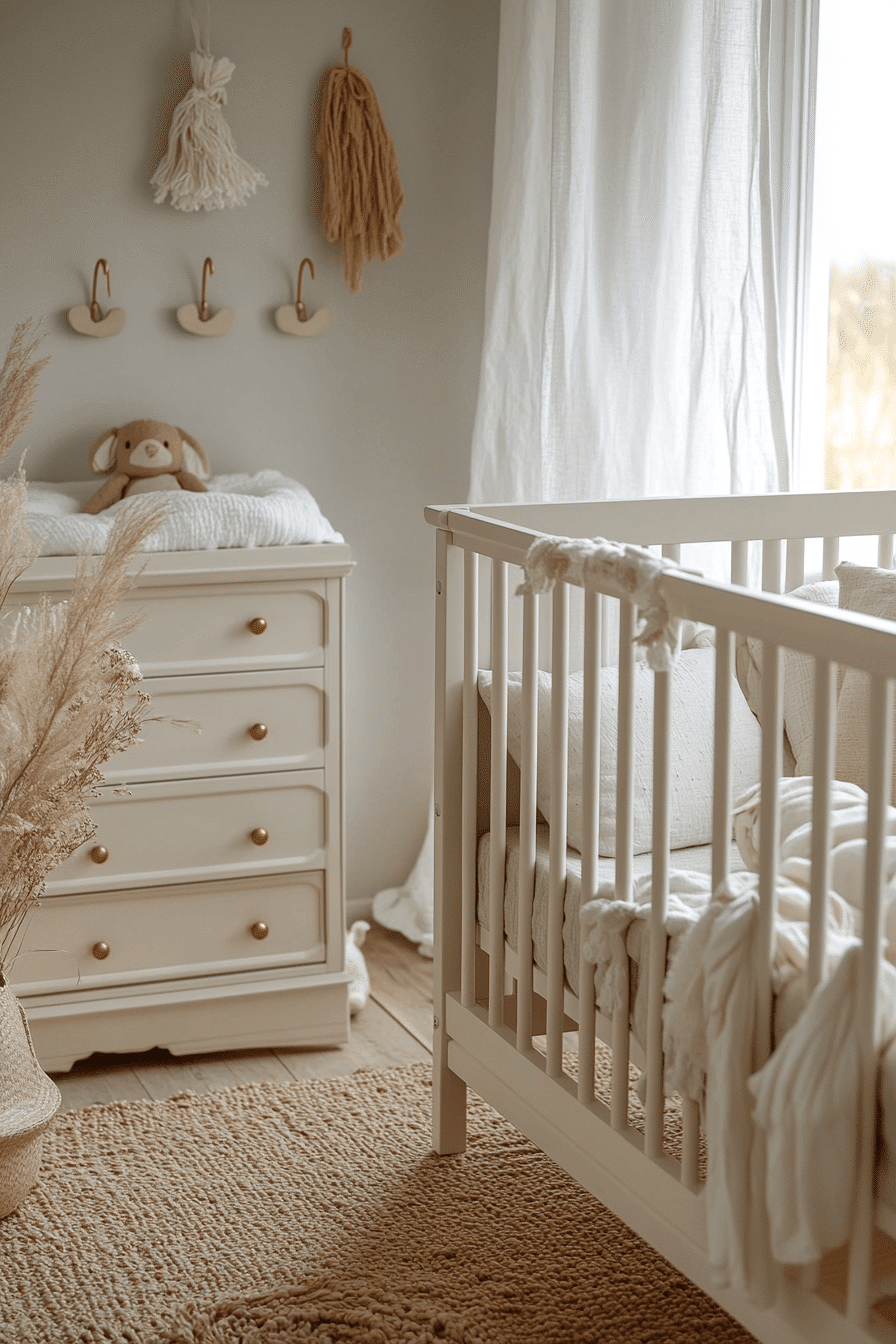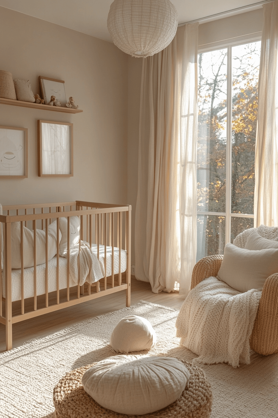Desert-inspired neutrals bring gentle warmth to a neutral baby nursery through beige, cream, and sand tones. The palette feels grounding yet light. Minimal furniture and soft textiles keep the space welcoming. This design supports calm energy and visual ease. Ideal for lovers of earthy neutrals.