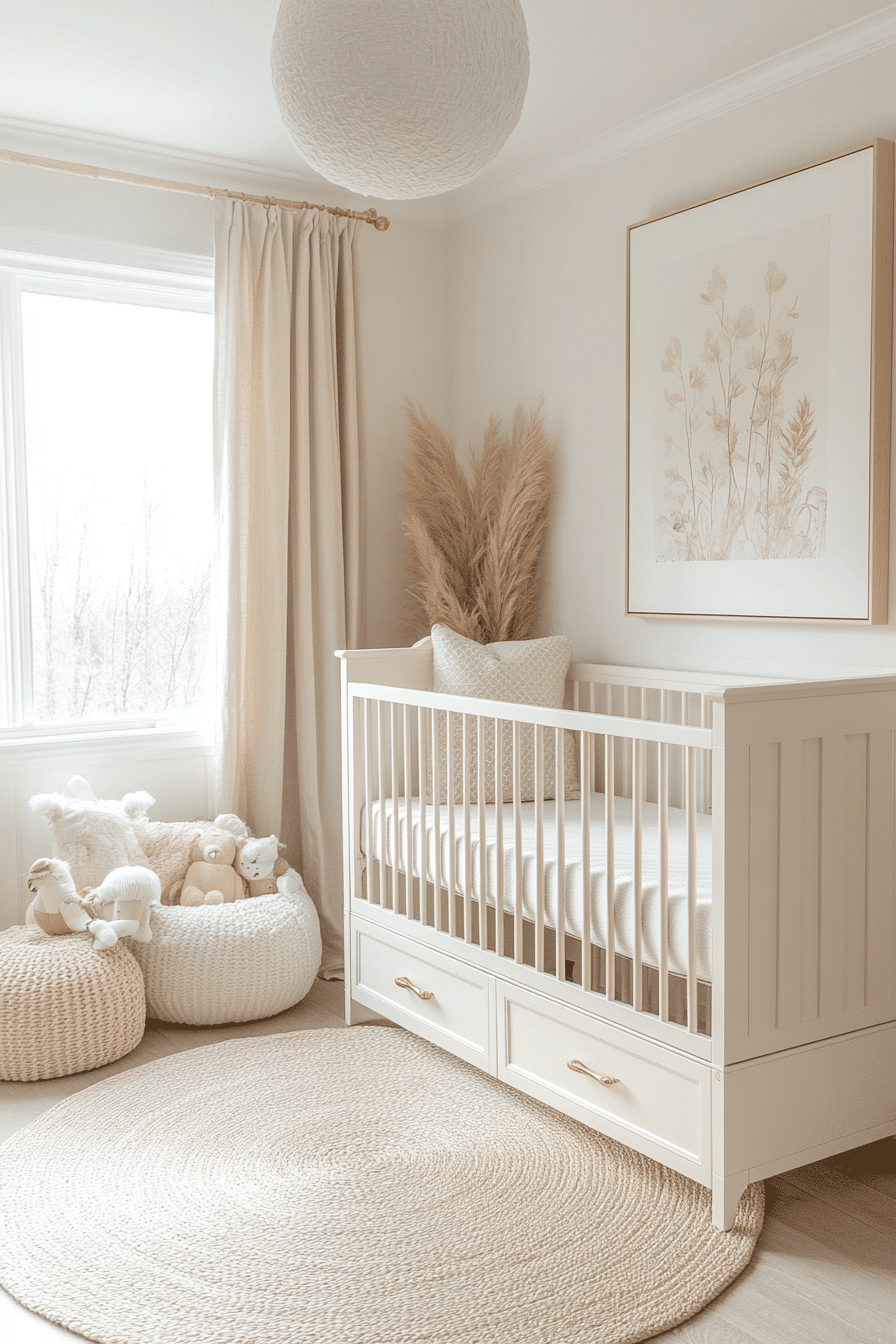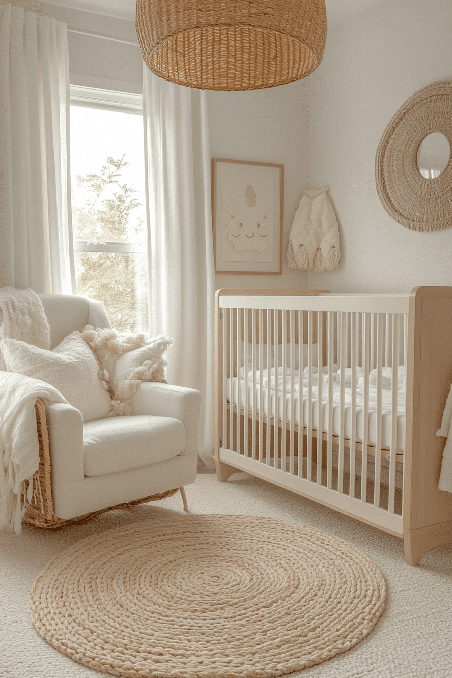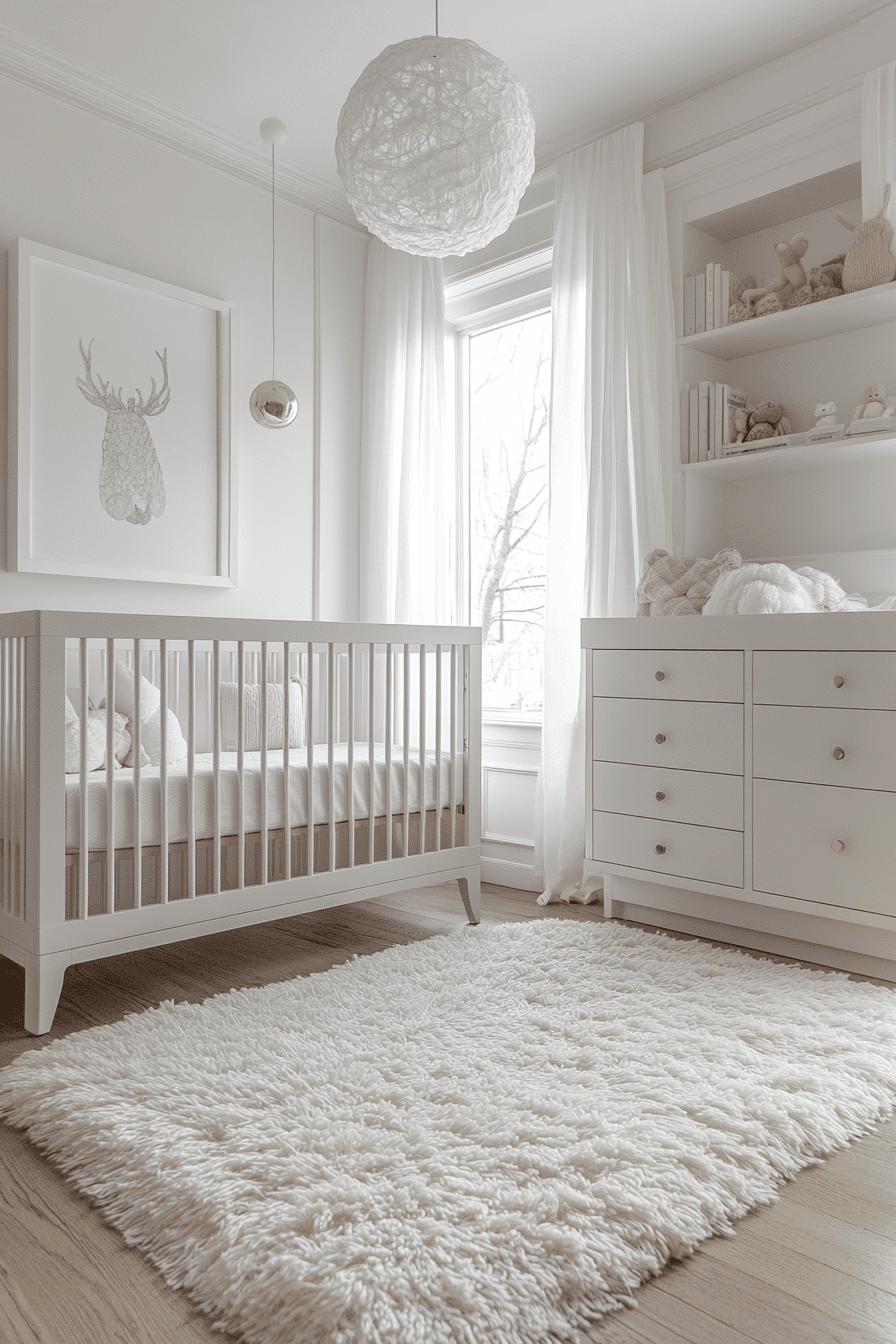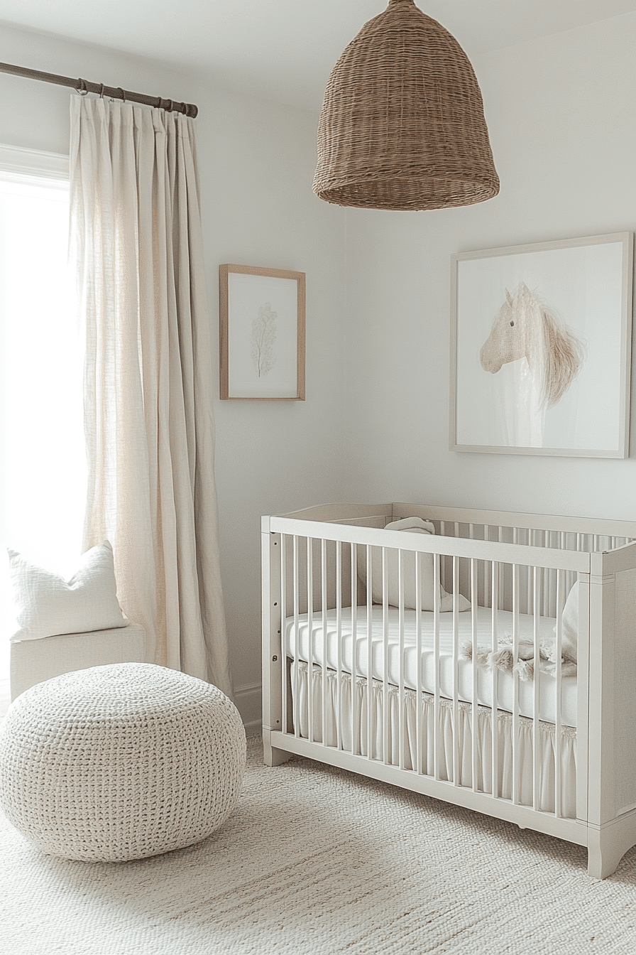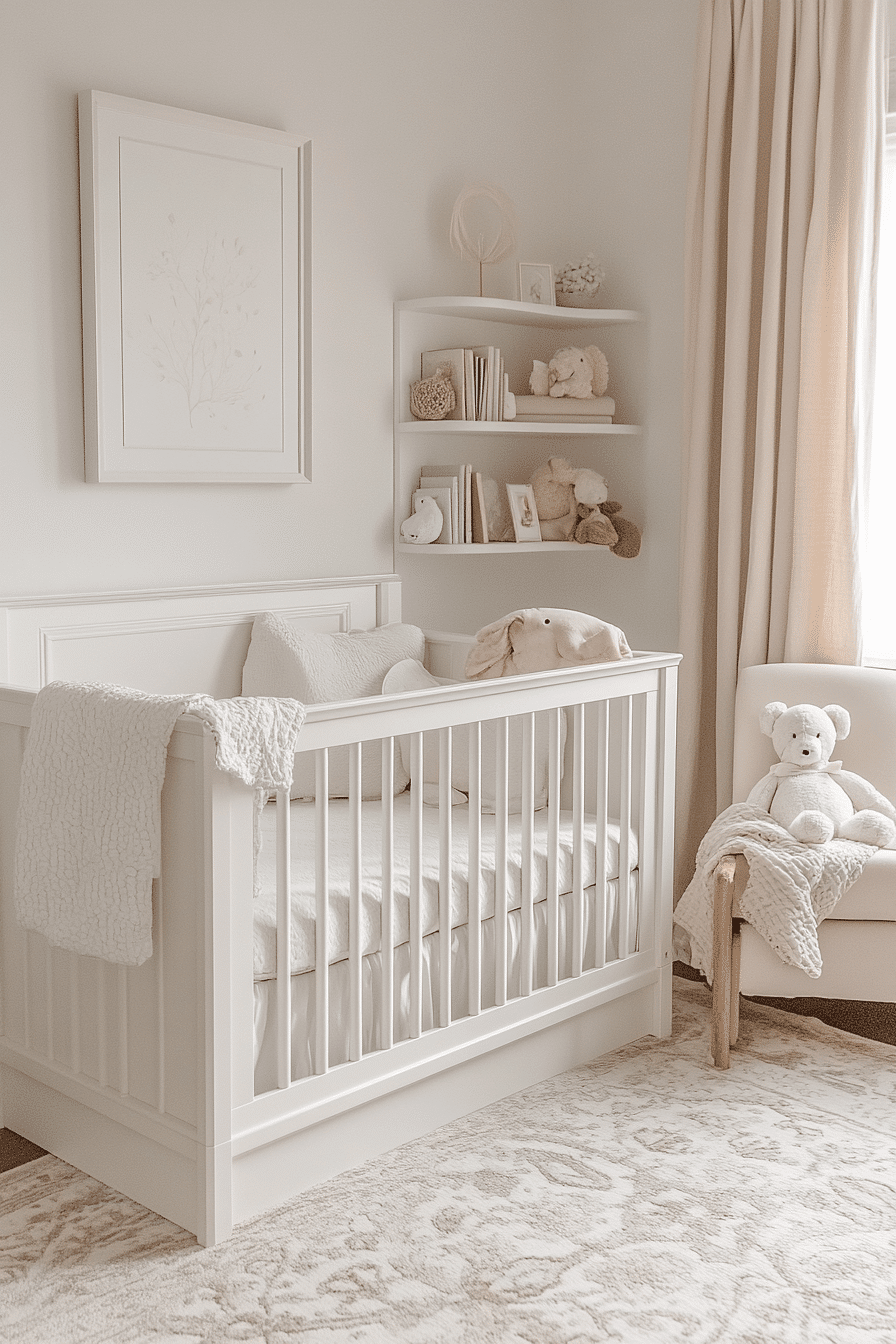 Pearl-like whites bring gentle luminosity to a neutral baby nursery while remaining soft and comforting. Light-reflective textiles add dimension. White-on-white layering feels elegant and serene. This style suits those who love airy spaces. Calm and soothing throughout the day.