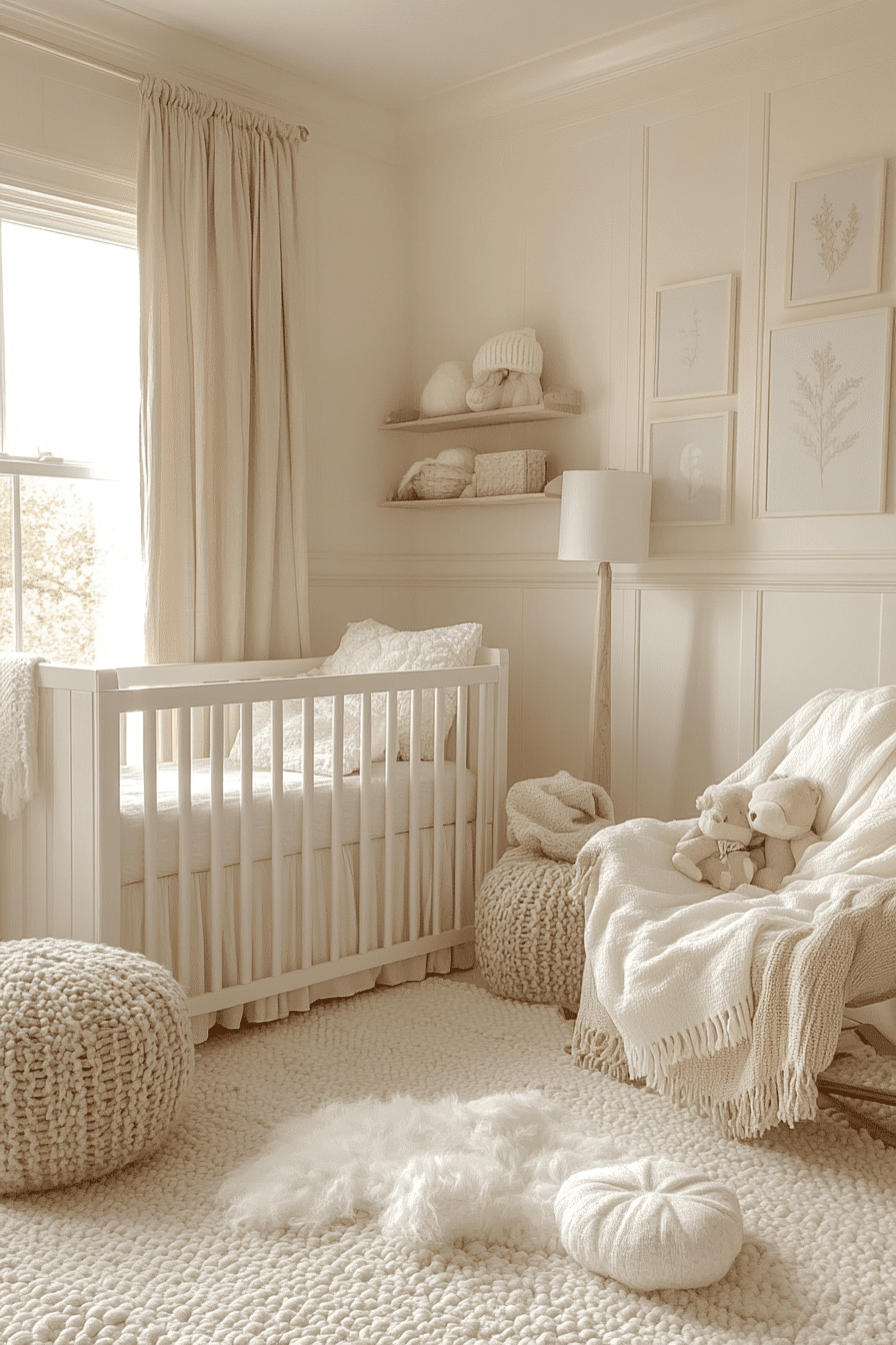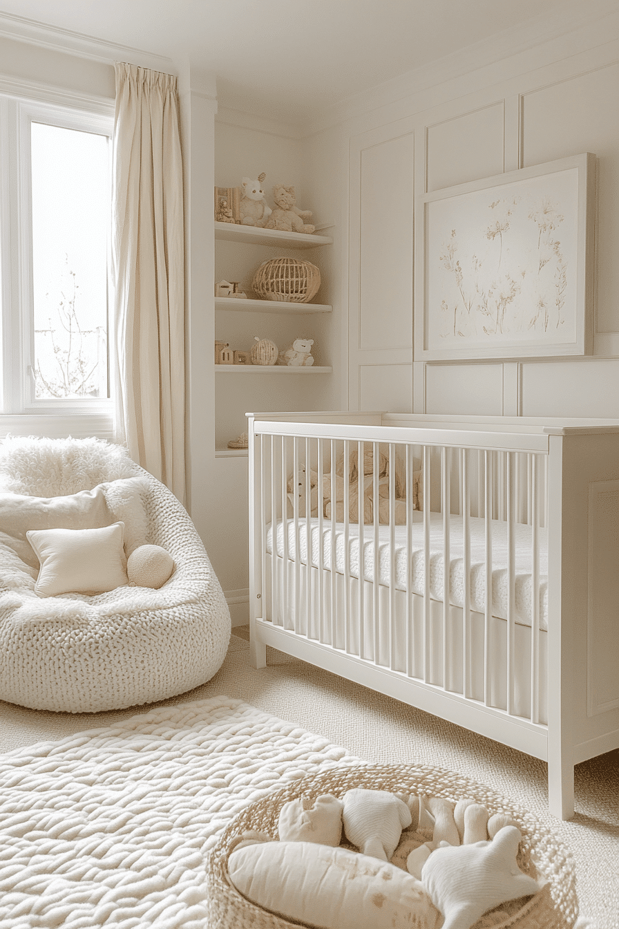 Ivory and soft white layers shape a neutral baby nursery that feels cloud-like, plush, and comforting. Rounded shapes and pale fabrics enhance the softness. The palette minimizes distraction and encourages calm focus. This nursery feels timeless and emotionally soothing. Ideal for peaceful beginnings.