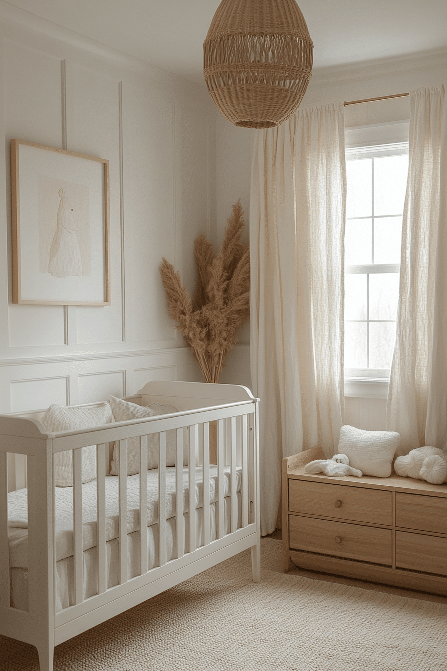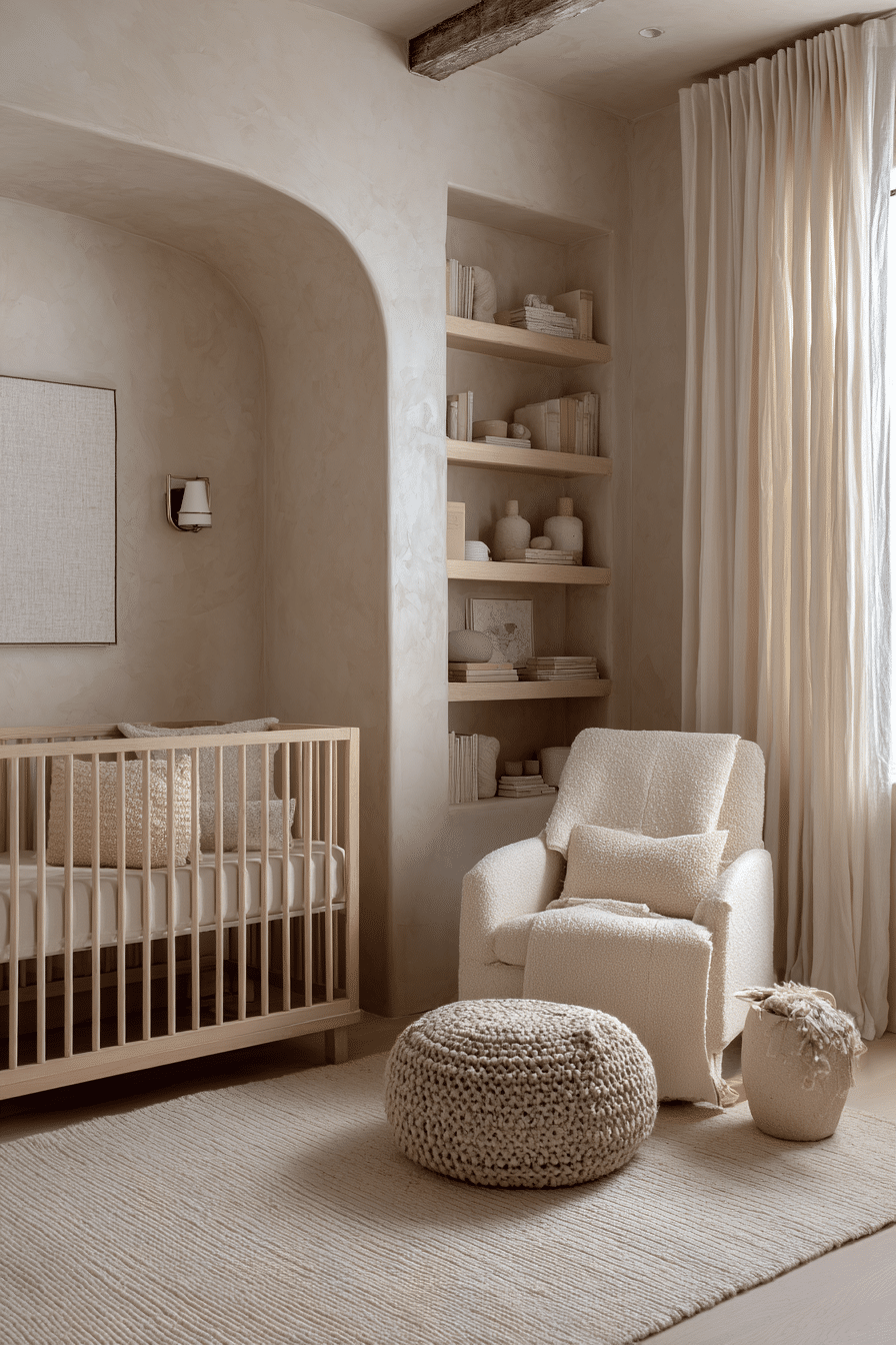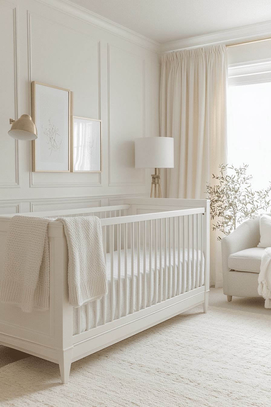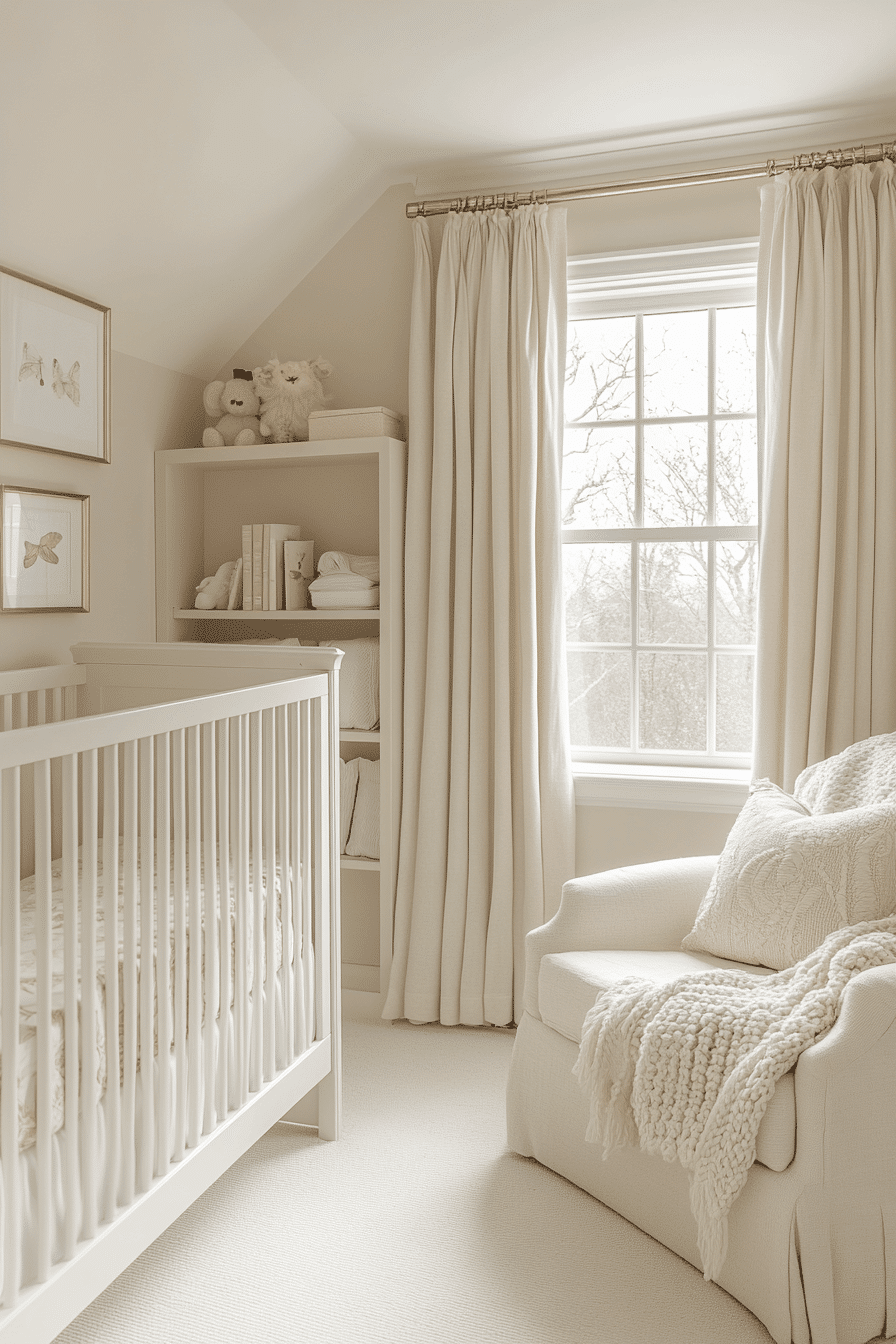 Layered ivory shades create a neutral baby nursery filled with gentle glow and peaceful energy. Slight variations within the ivory palette add depth while keeping the room calm. Soft fabrics and understated metallic accents bring quiet sophistication. The space feels nurturing and timeless rather than stark. This look grows gracefully alongside your child.