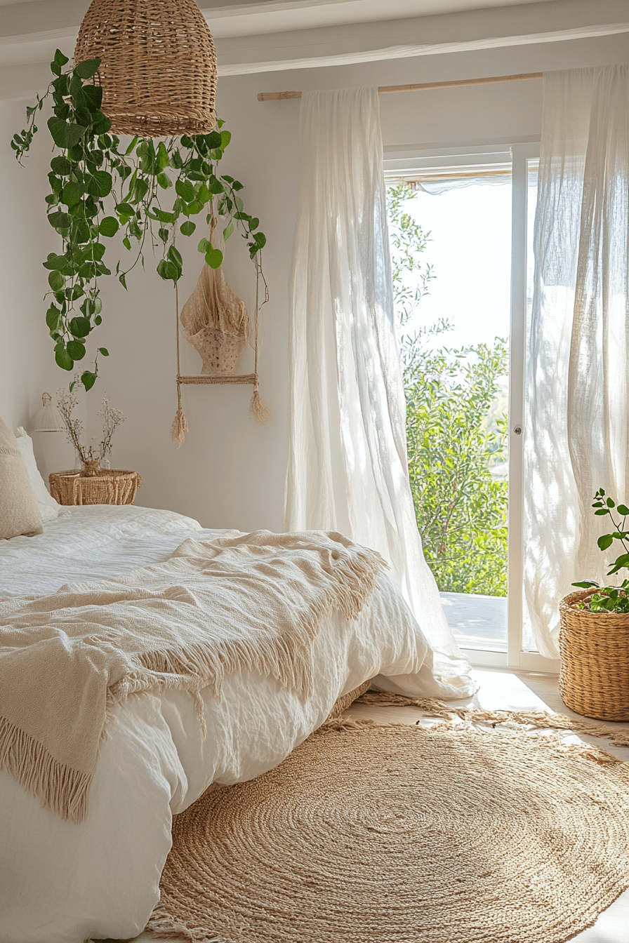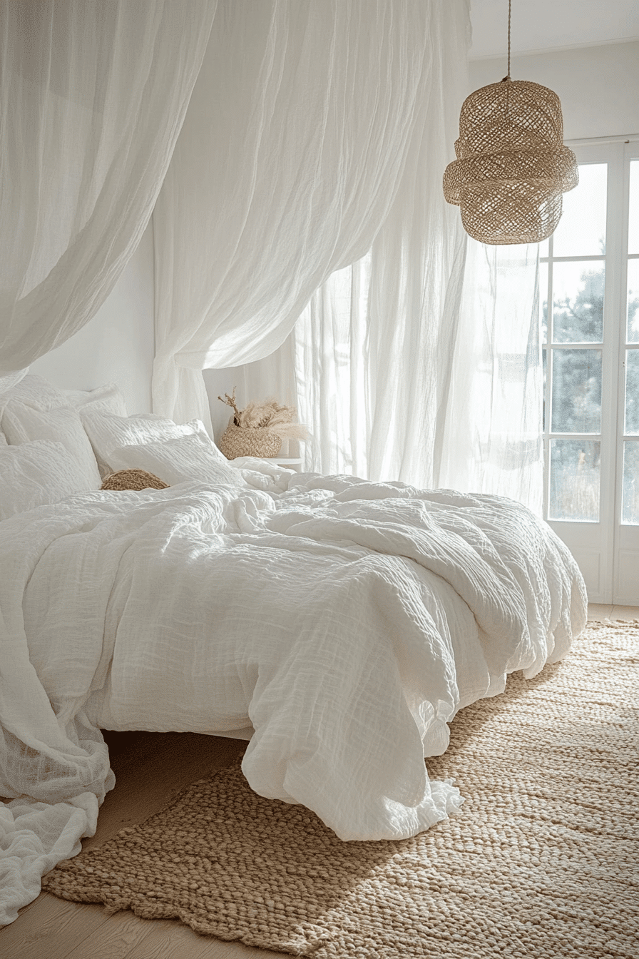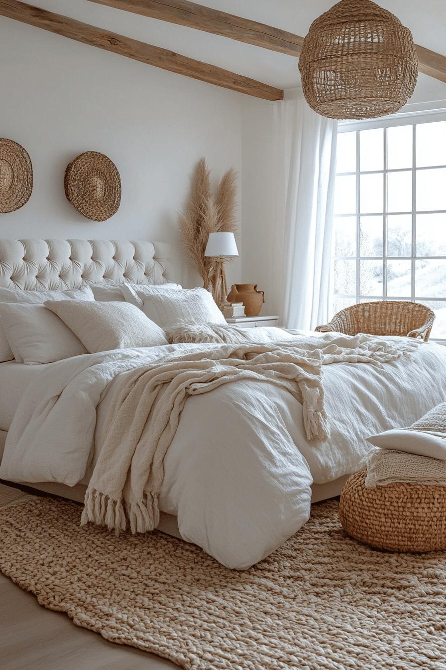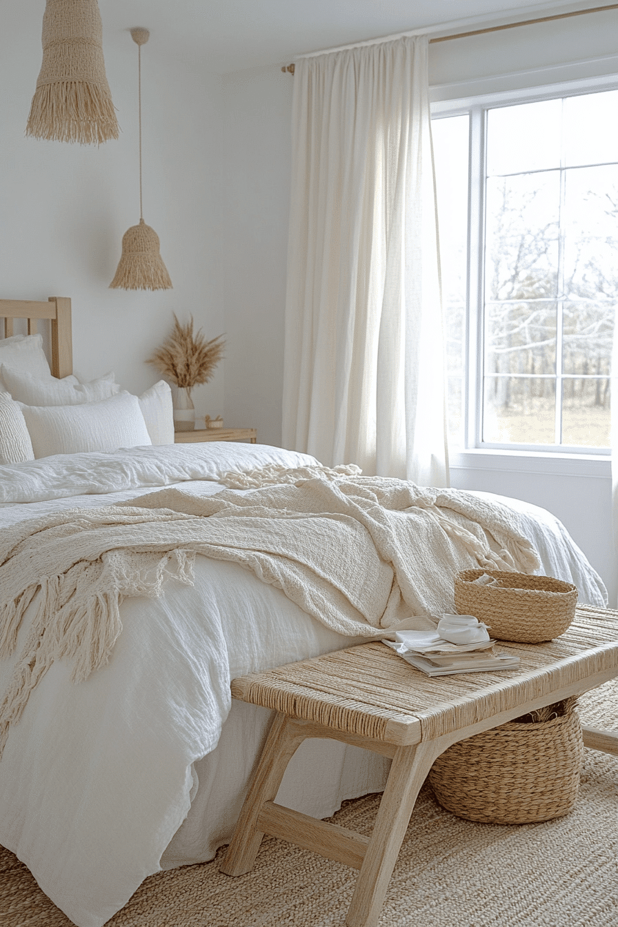 Breezy natural textures define relaxed white boho bedroom ideas. Rattan lighting, woven pillows, and linen bedding bring organic warmth to the white palette. Light wood furniture adds subtle contrast without disrupting the calm environment. Sheer curtains allow sunlight to dance across the room. The overall vibe feels open and carefree. See more white boho bedroom ideas with breezy natural style.