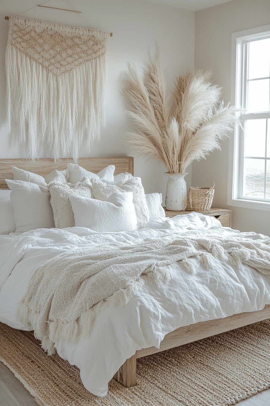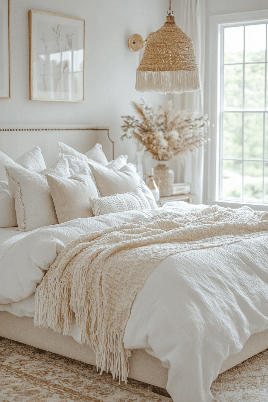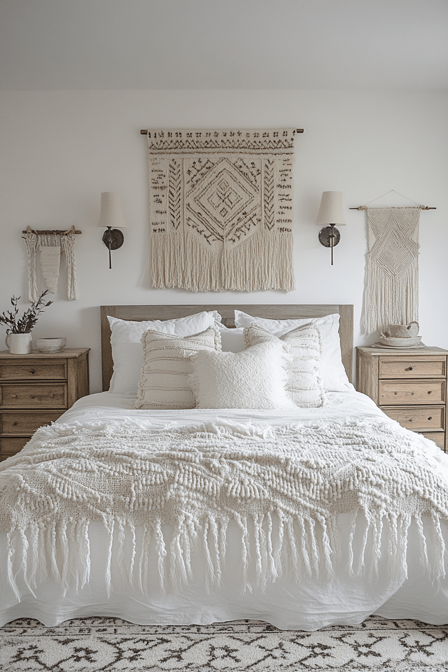 Fringe accents add playful character to white boho bedroom ideas while maintaining a soft neutral palette. Tassel pillows, textured blankets, and macramé wall art create movement and depth. Frosted glass and pale wood details add subtle contrast. The layered textures keep the space visually interesting. The design feels relaxed and welcoming. Discover white boho bedroom ideas that highlight fringe and texture.