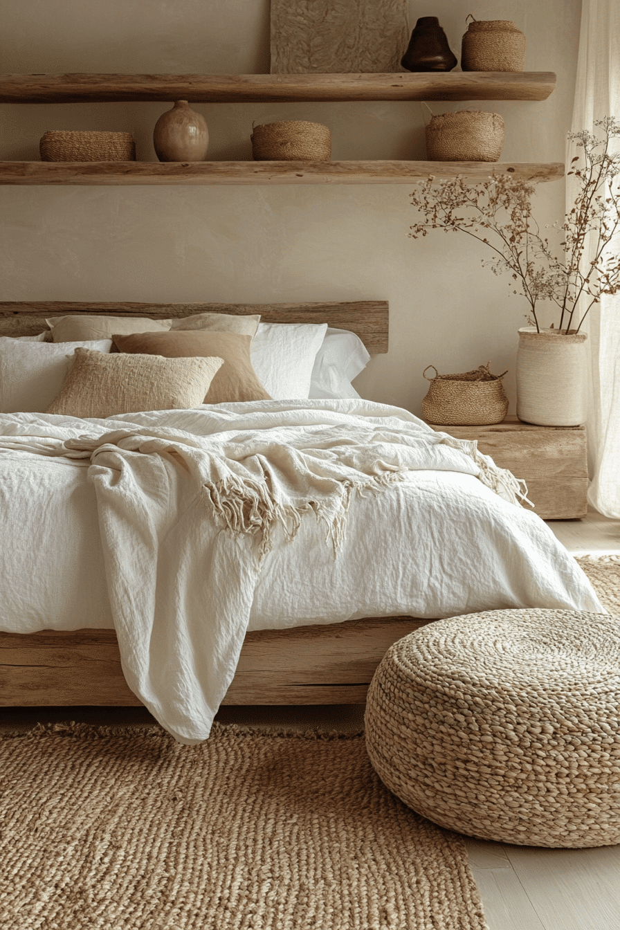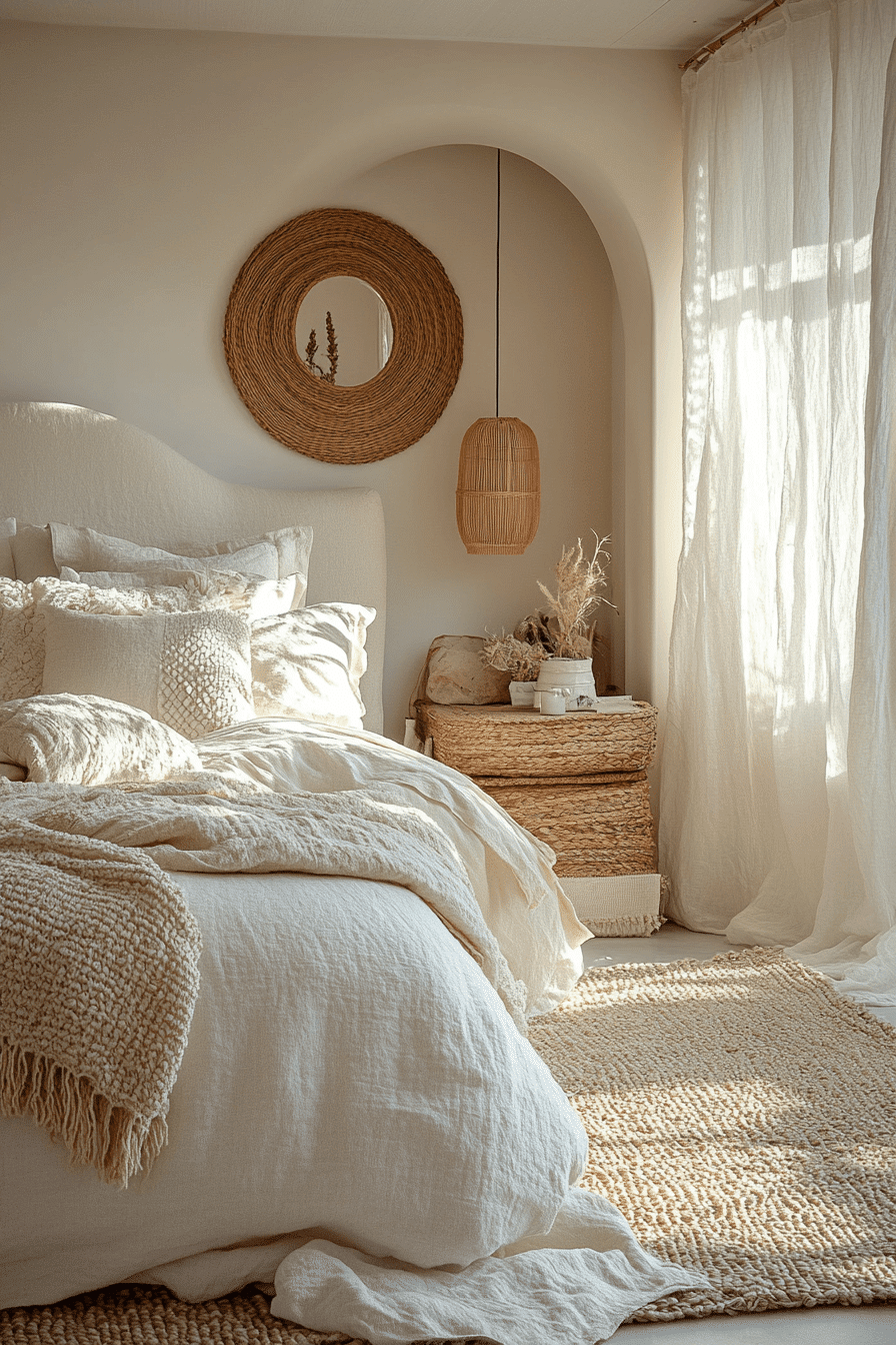 Cream-colored walls and natural fabrics create a versatile base for white boho bedroom ideas. Linen bedding and off-white rugs bring warmth to the neutral palette. Woven lighting and sculptural decor add personality. The look stays flexible for seasonal updates. The room feels cozy and inviting. Discover white boho bedroom ideas styled with creamy neutrals.