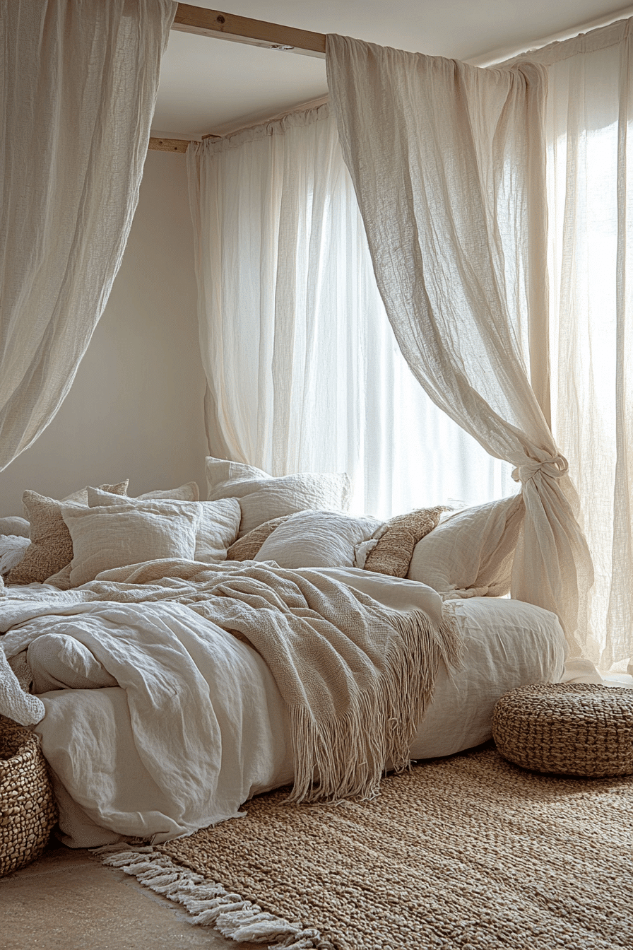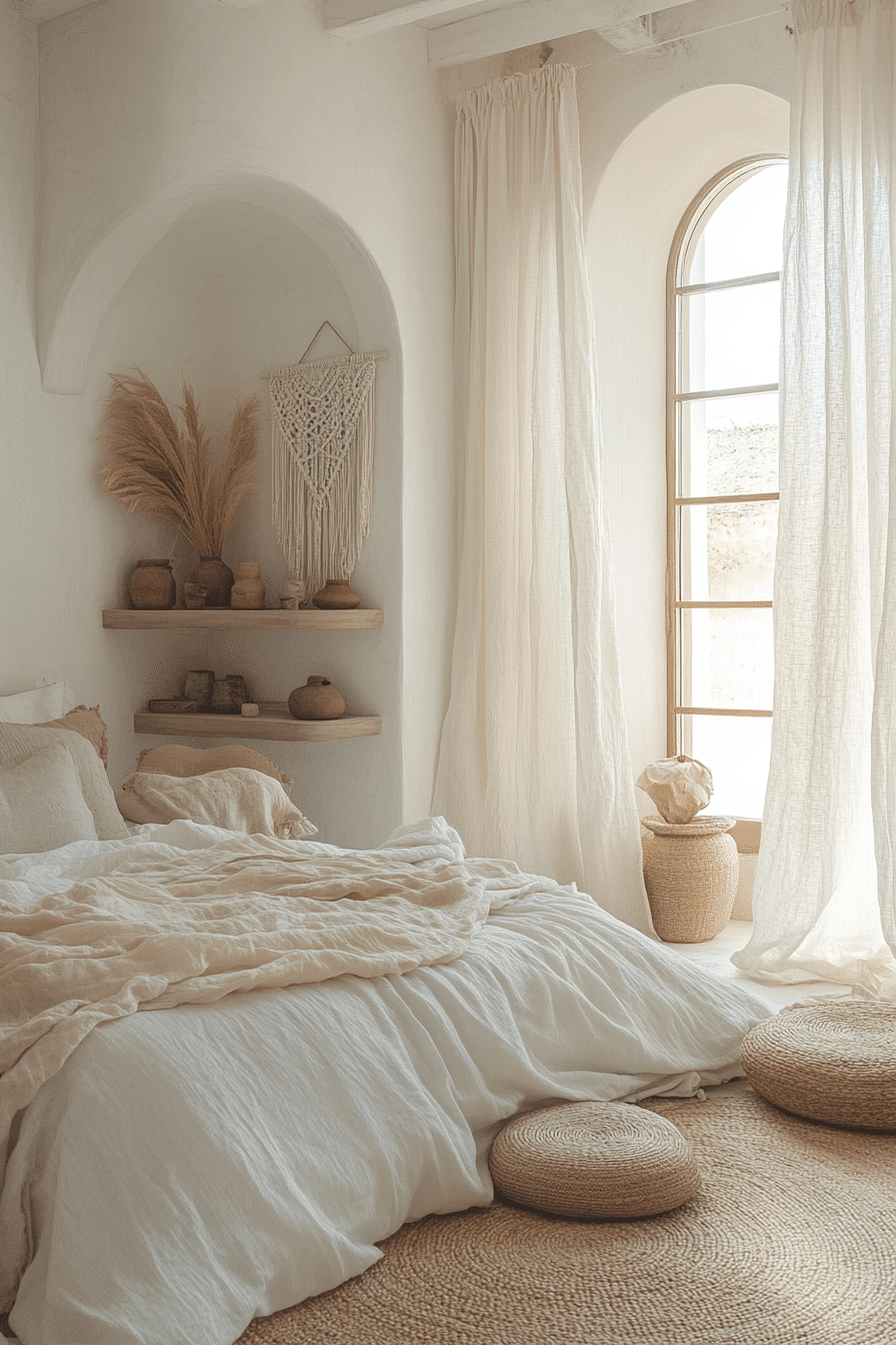 Flowing drapery creates dreamy white boho bedroom ideas that feel intimate and elegant. Sheer curtains surrounding the bed form a cozy cocoon. Neutral throws and warm lighting enhance the relaxing atmosphere. The movement of the fabrics adds softness to the space. The bedroom becomes a calm retreat. Discover white boho bedroom ideas with romantic draped fabrics.
