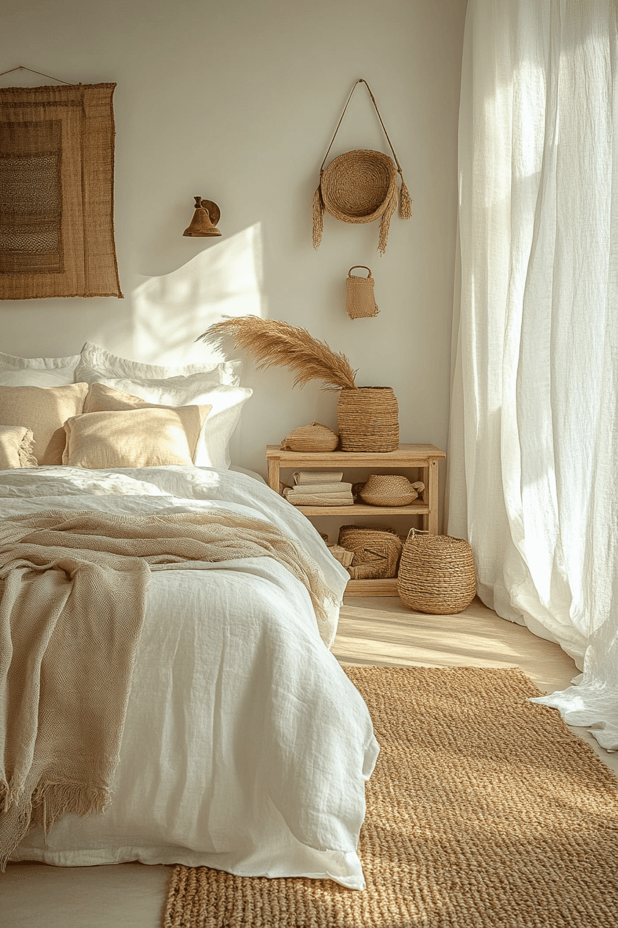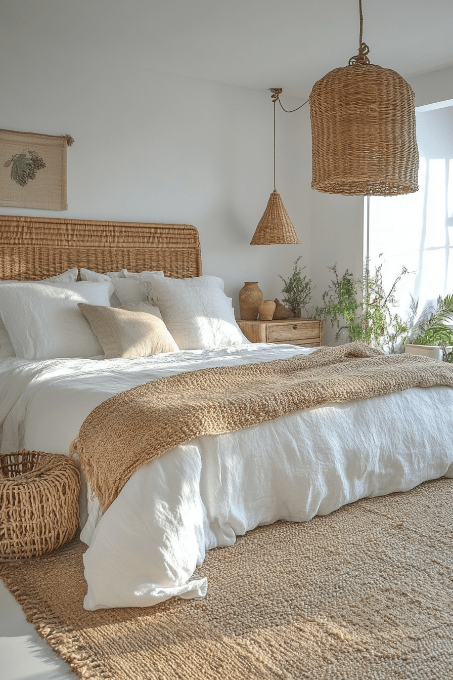 Woven decor pieces shine in white boho bedroom ideas filled with natural light. Rattan chairs, jute rugs, and woven pendant lights add organic warmth. Sunlight highlights the craftsmanship of these materials. Handmade accents enhance the bohemian personality of the room. The space feels bright and relaxed. Browse white boho bedroom ideas celebrating woven textures.