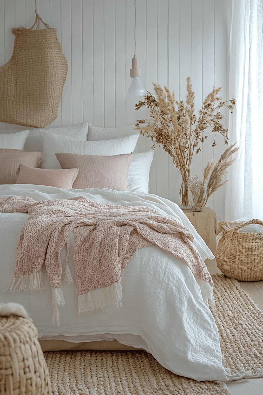 Muted accents like blush or sand can subtly enrich white boho bedroom ideas. These gentle tones warm the palette without disrupting its brightness. Textured rugs and diffused lighting enhance the relaxed atmosphere. Dried florals complete the natural aesthetic. The room feels layered and harmonious. See white boho bedroom ideas with softly dusted tones.
