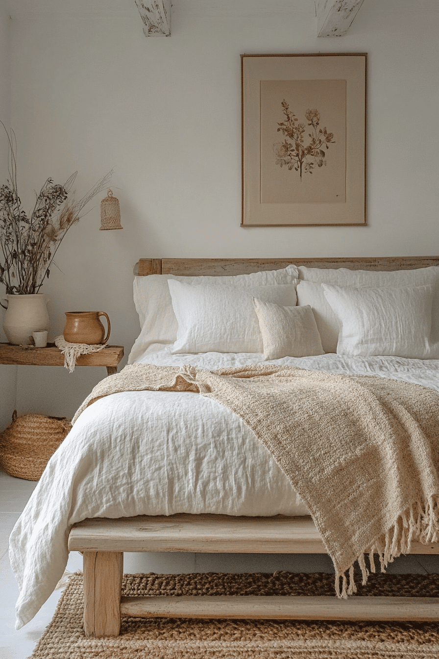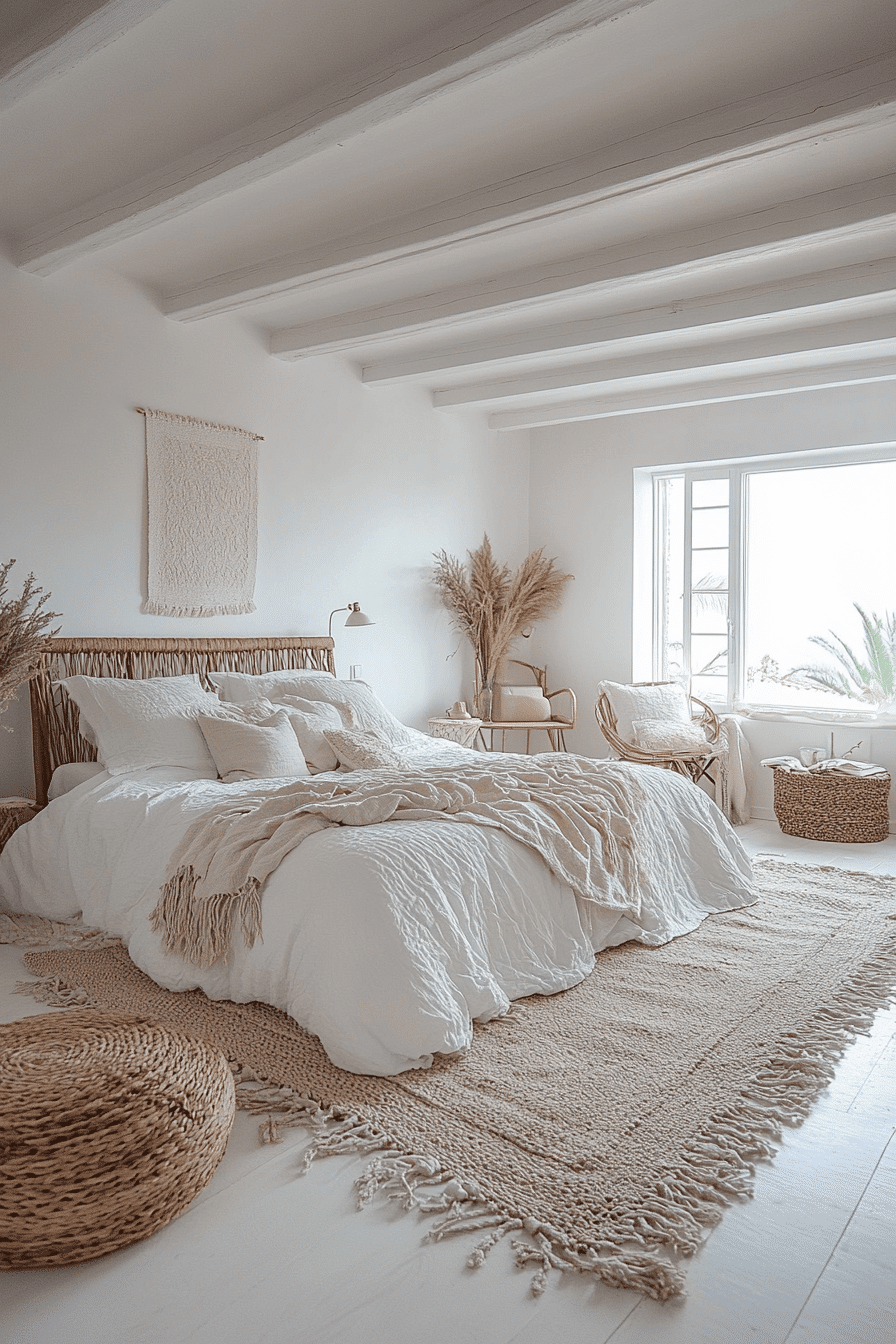 A minimalist approach can make white boho bedroom ideas feel calm and intentional. Clean lines paired with tactile materials like knit blankets and woven decor create quiet beauty. Whitewashed wood furniture enhances the natural feel. The restrained palette promotes relaxation and simplicity. Each element feels purposeful and serene. Browse white boho bedroom ideas that celebrate minimal elegance.