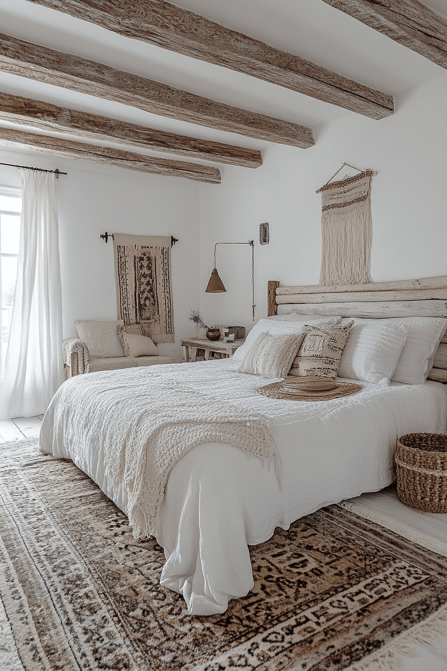 Global-inspired decor adds depth to white boho bedroom ideas while maintaining a light palette. Tribal textiles, layered rugs, and artisan pieces bring cultural warmth. White-on-white patterns keep the space cohesive. Collected treasures give the room a lived-in feel. The overall style feels adventurous yet calm. Discover white boho bedroom ideas inspired by global influences.