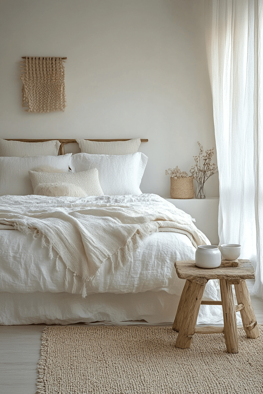 Layered ivory tones create a peaceful foundation for white boho bedroom ideas that feel airy and inviting. Mixing subtle shades of cream, pearl, and off-white keeps the palette visually rich without losing its calm vibe. Natural textures like jute rugs and woven baskets add grounding warmth. Light wood furniture enhances the relaxed bohemian mood. The space feels soft, balanced, and beautifully bright. Tap to explore more white boho bedroom ideas inspired by layered ivory tones.