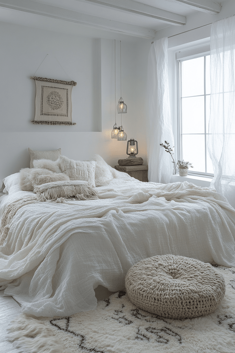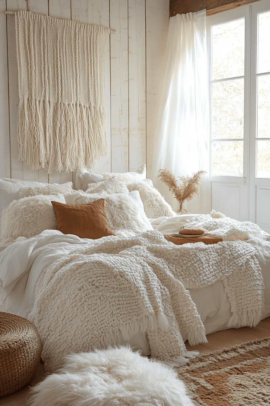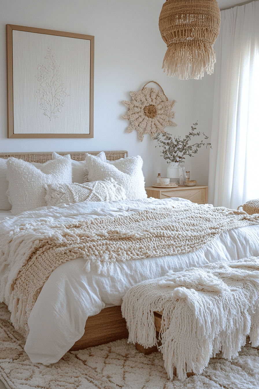 Cozy textiles transform white boho bedroom ideas into warm retreats. Quilted bedding, chunky knit blankets, and plush rugs create an inviting environment. Faux fur accents enhance the comforting atmosphere. Soft lighting spreads a gentle glow across the room. The bedroom feels like a peaceful escape. Explore more white boho bedroom ideas designed for cozy living.
