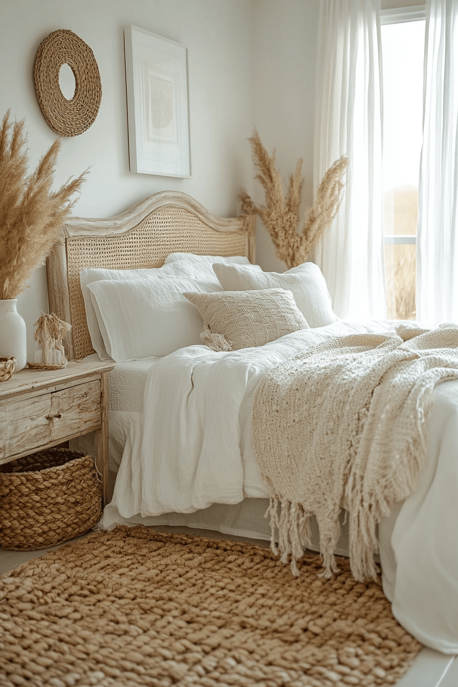 Silky fabrics paired with earthy materials create sophisticated white boho bedroom ideas. Smooth bedding contrasts with rustic wood furniture and clay decor. Pampas grass and woven rugs introduce natural texture. The balance between elegance and nature feels calming. The design feels luxurious yet grounded. Explore white boho bedroom ideas blending silk and earthy style.