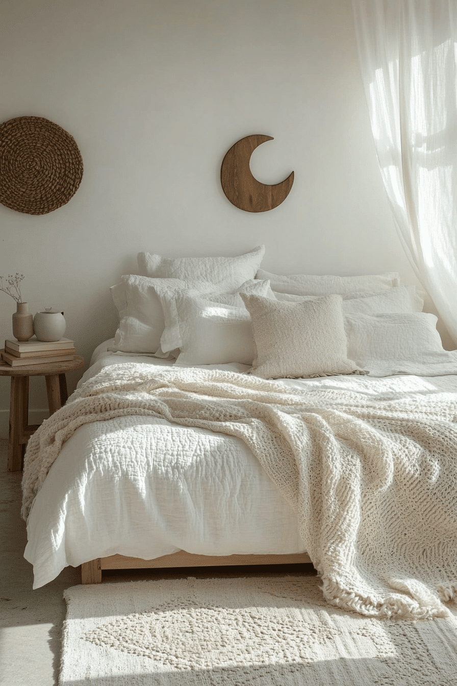 Crisp white bedding combined with cozy textures creates inviting white boho bedroom ideas. Structured linens bring freshness while knit blankets soften the look. Wool rugs and handcrafted decor add character. The balance between crisp and cozy feels modern and welcoming. The room remains bright yet comfortable. Discover white boho bedroom ideas that mix clean style with comfort.