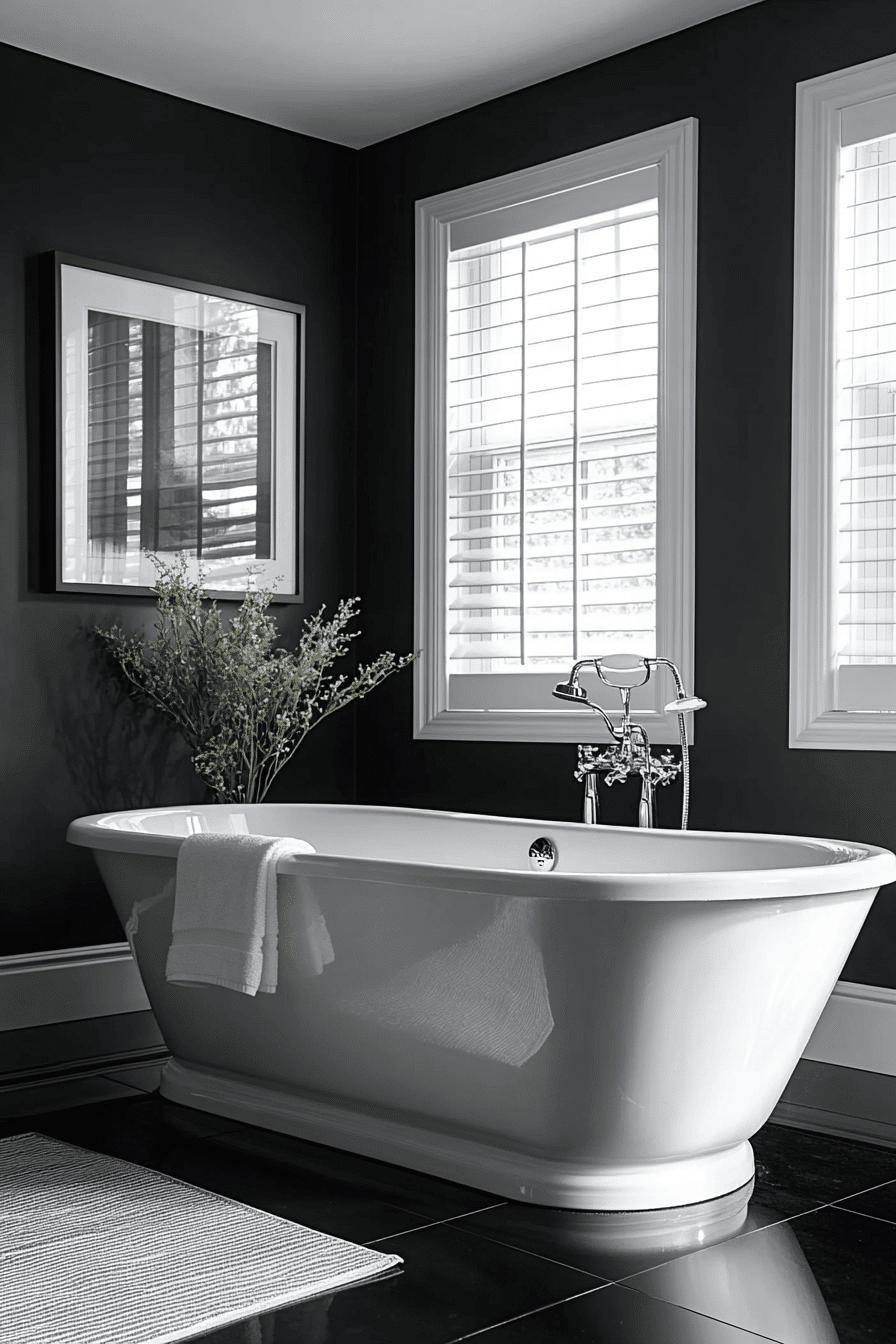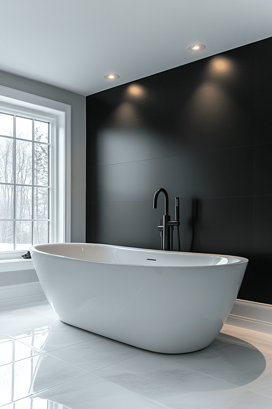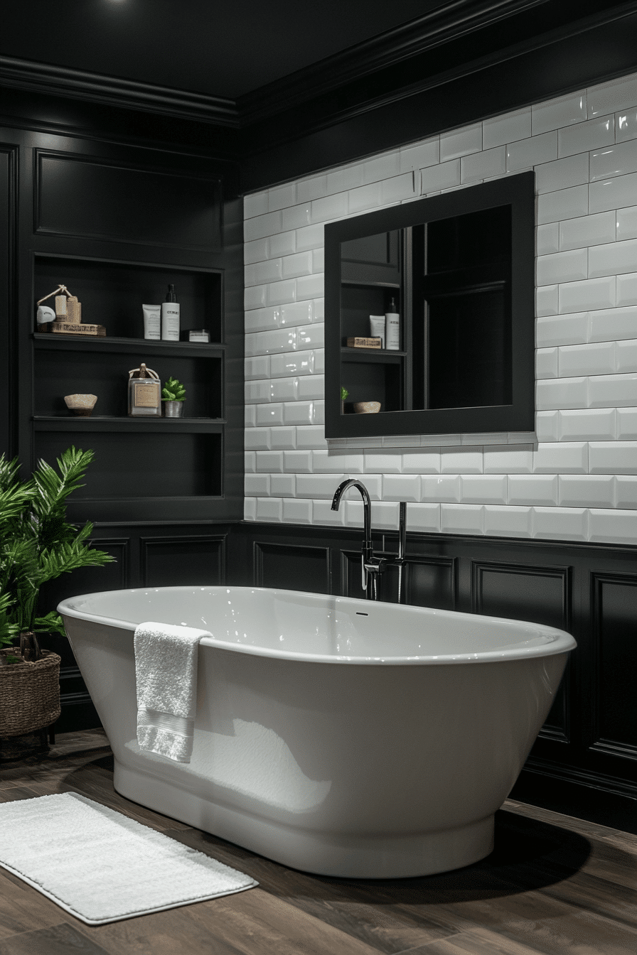 Soaking-focused contrast frames the tub as a centerpiece. These black and white bathroom ideas use dark backdrops with light ceilings. Ambient lighting adds depth. Surrounding elements stay minimal. Serenity becomes the focal point.