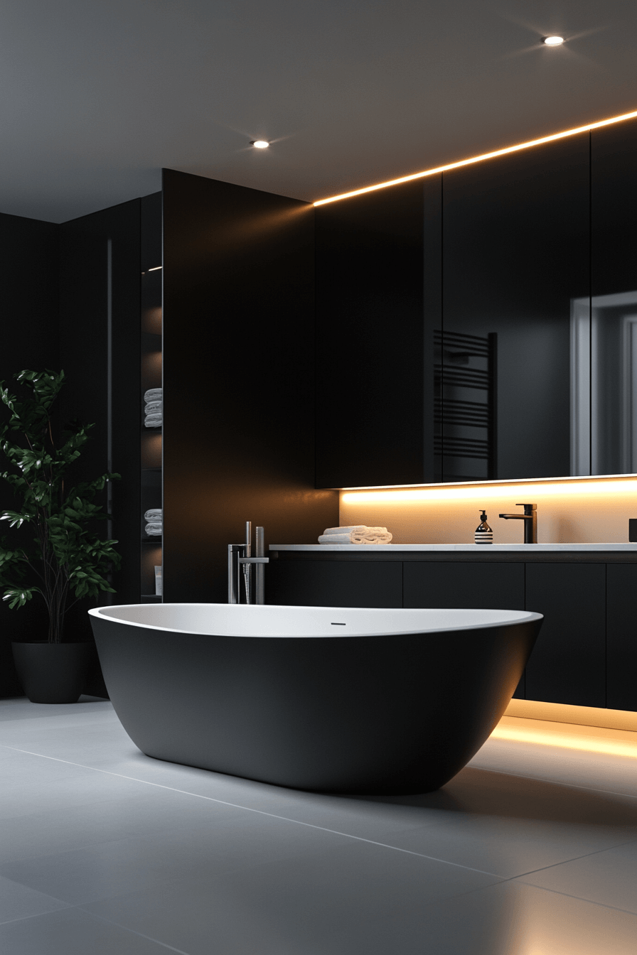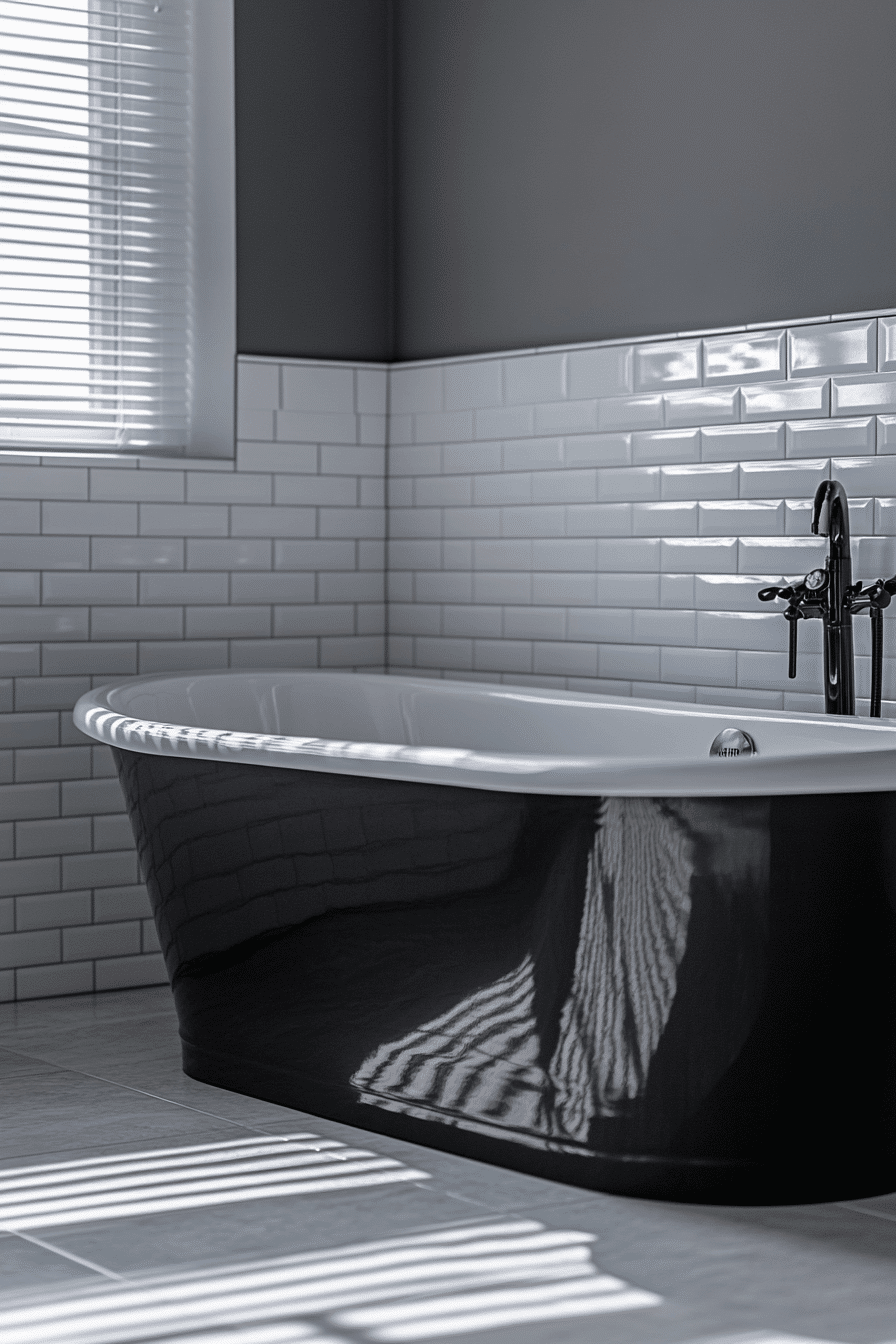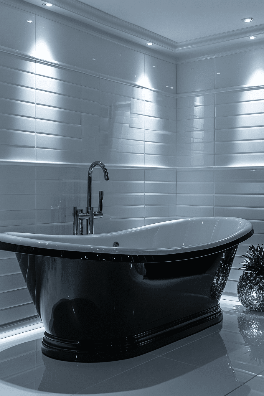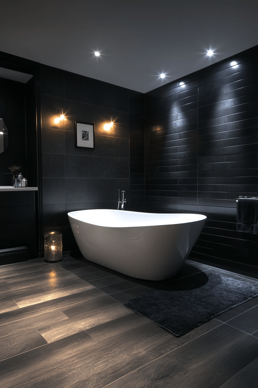 Soaking-focused contrast frames the tub as a centerpiece. These black and white bathroom ideas use dark backdrops with light ceilings. Ambient lighting adds depth. Surrounding elements stay minimal. Serenity becomes the focal point.