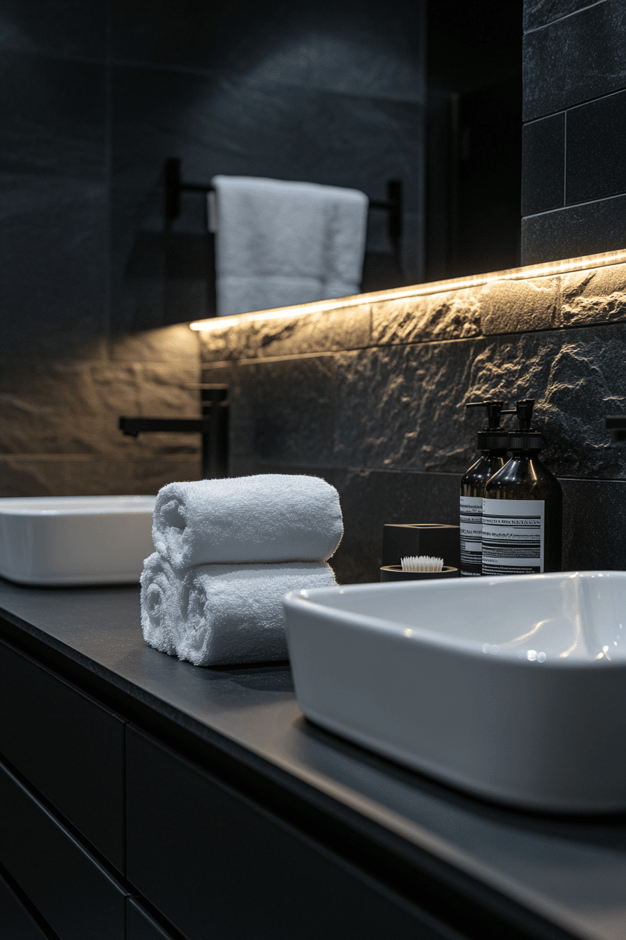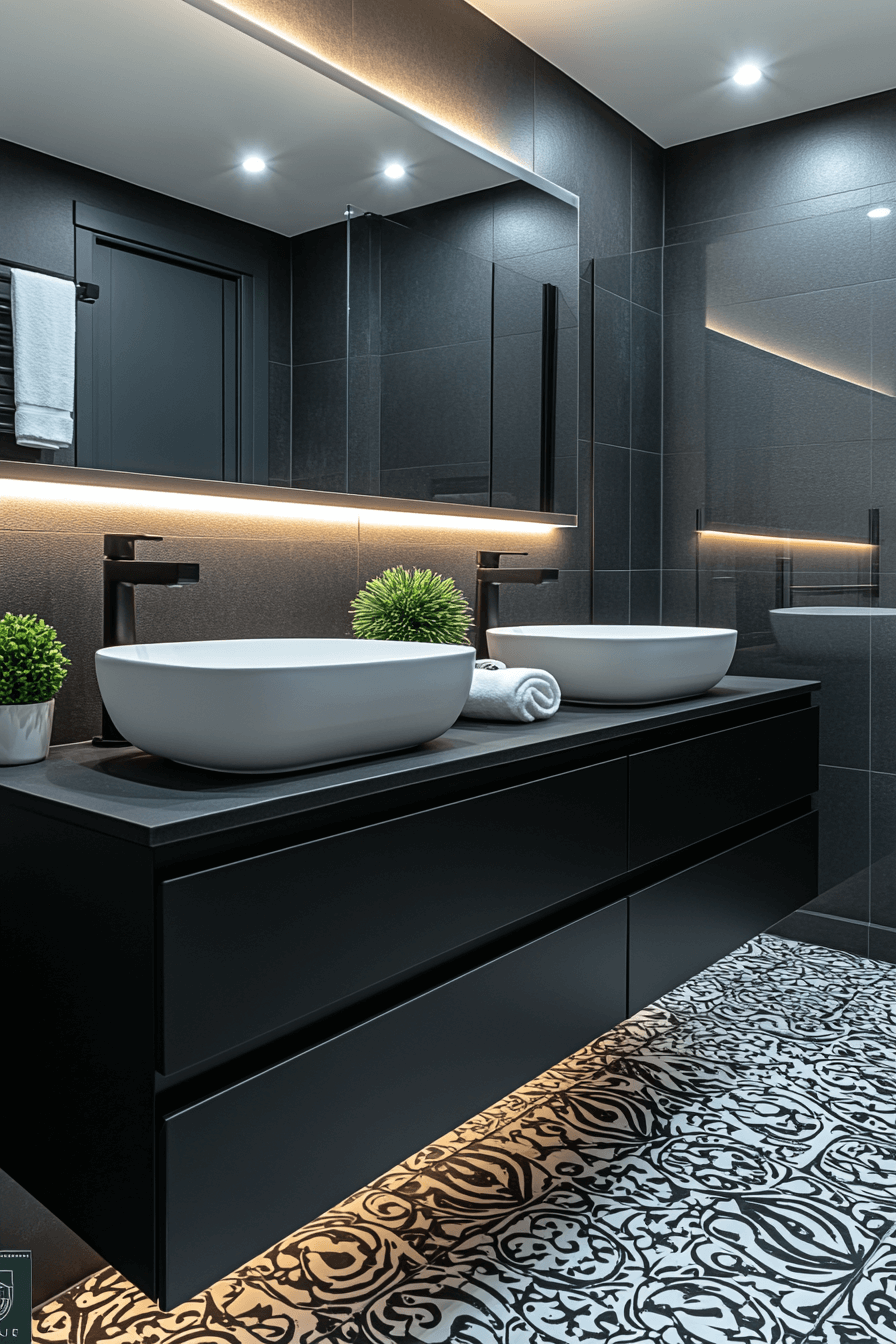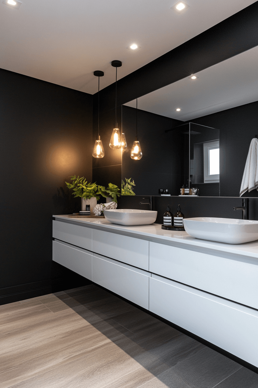 Statement contrast styling creates bold personality with control. These black and white bathroom ideas use dark walls with floating white vanities. Soft lighting eases intensity. Fixtures remain sleek and purposeful. Drama meets functionality.