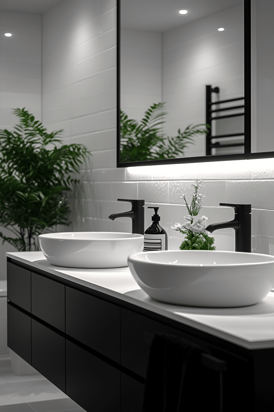 Noir-inspired styling introduces drama while staying livable. These black and white bathroom ideas combine dark wall tiles with bright sinks and flooring. Warm lighting keeps the mood inviting. Accessories stay monochrome for cohesion. The space feels indulgent yet fresh.