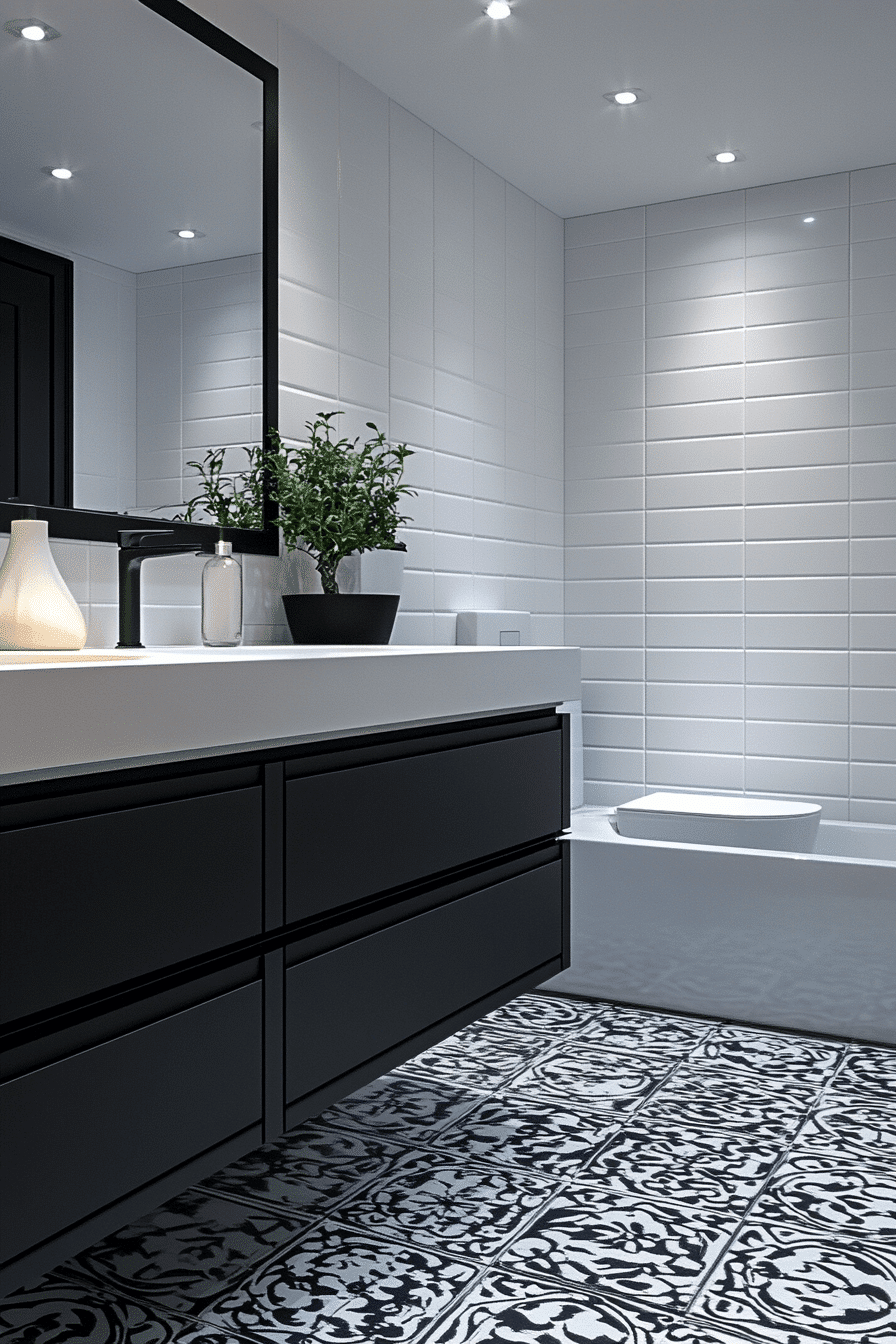 Balanced vanity layouts create openness without sacrificing style. These black and white bathroom ideas often feature floating black vanities paired with pale countertops. Textured tile floors add interest while keeping the palette simple. Under-vanity lighting enhances depth and flow. Compact bathrooms benefit beautifully from this approach.