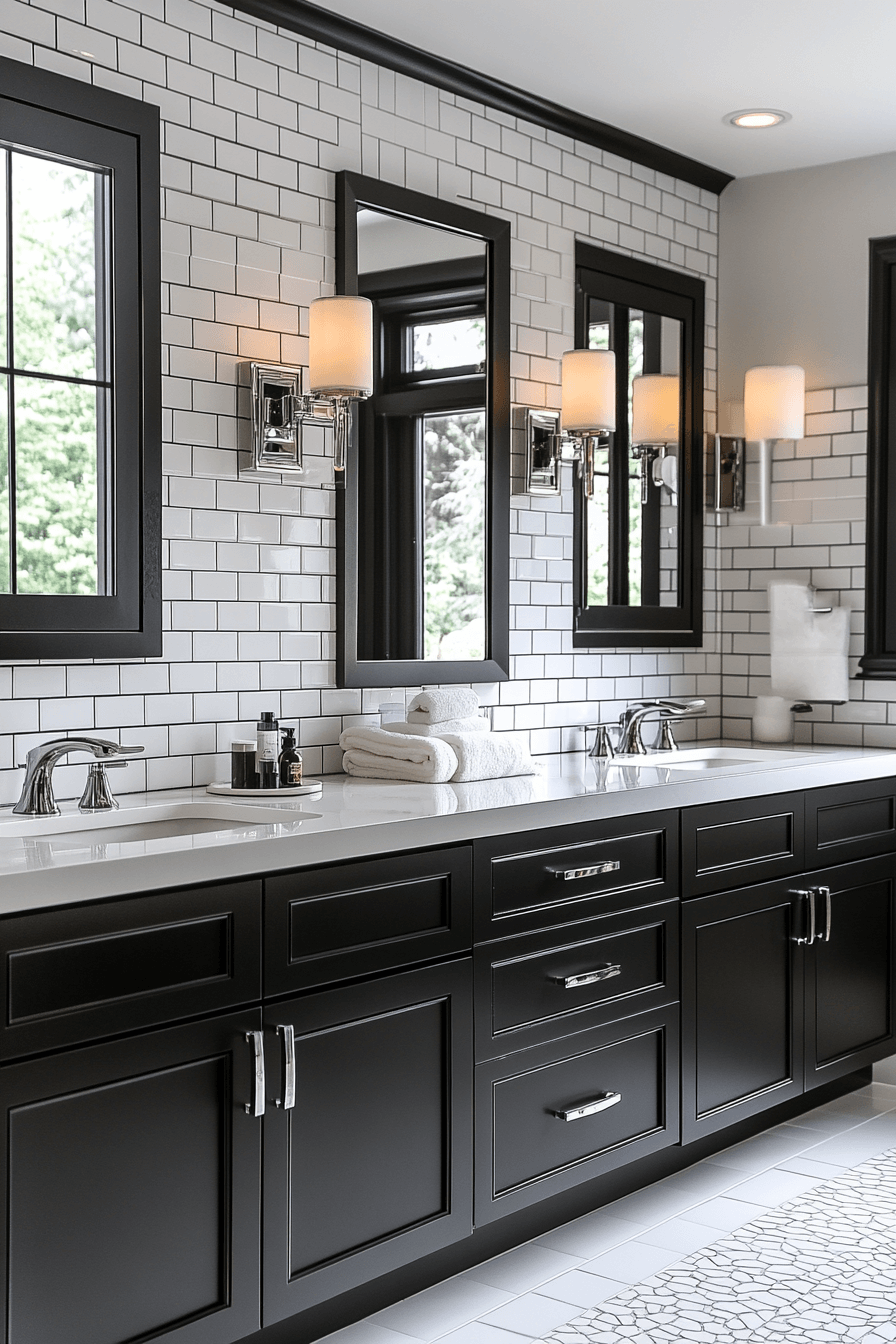 Contrast-forward design brings structure and confidence into everyday routines. These black and white bathroom ideas combine white walls with bold black cabinetry for visual clarity. Metallic hardware adds polish without distraction. Thoughtful lighting softens the contrast for comfort. The space feels strong yet welcoming.
