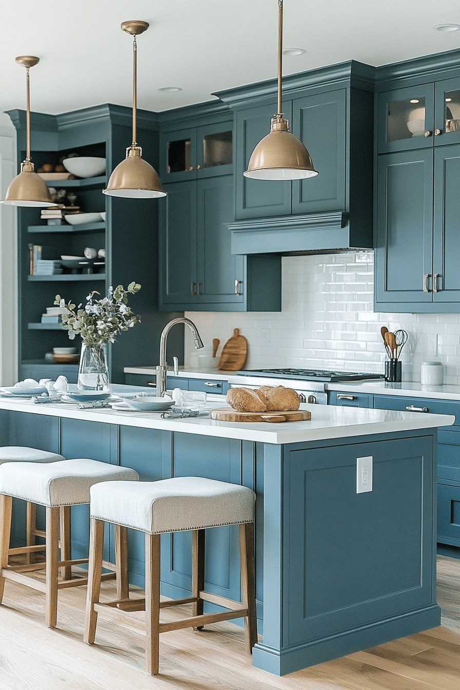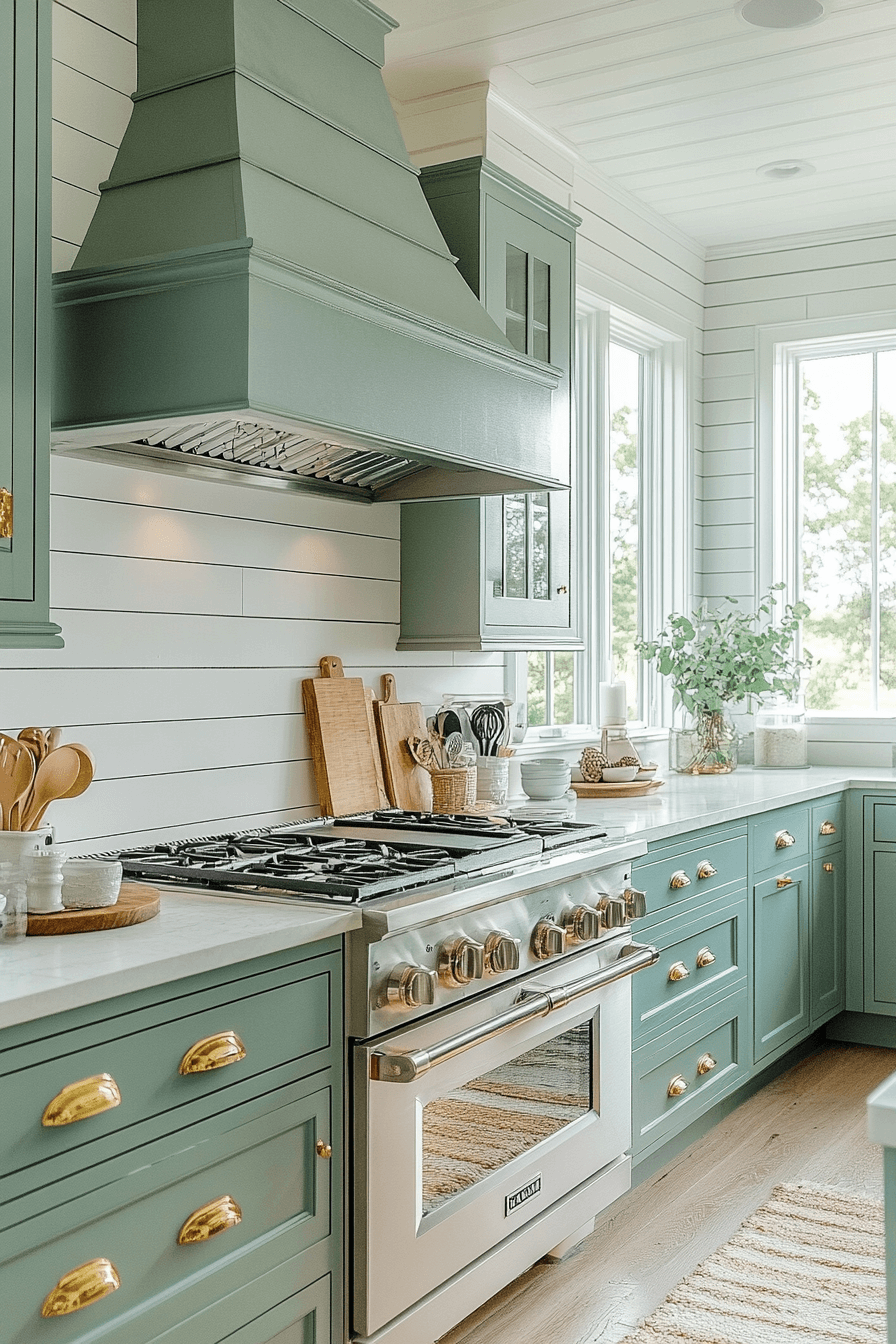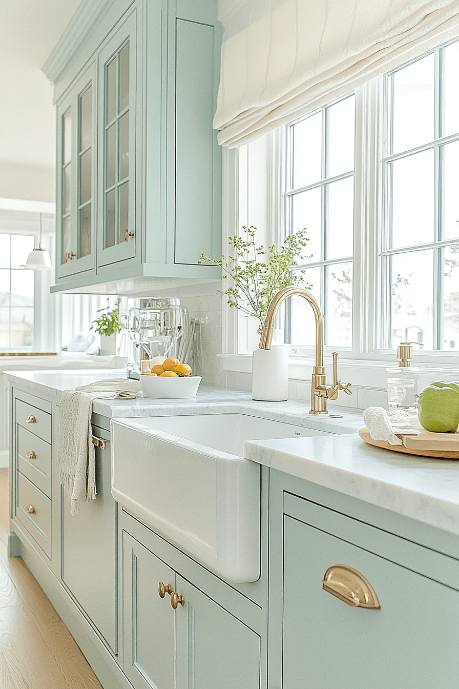 A breezy and relaxed mood emerges when blue green kitchen cabinets anchor a coastal-inspired design. Their soft tone creates a gentle backdrop for airy decor and clean styling. Whites and sandy neutrals amplify the open, peaceful feel. This palette transitions effortlessly between coastal homes and urban interiors. The kitchen feels calm and welcoming.