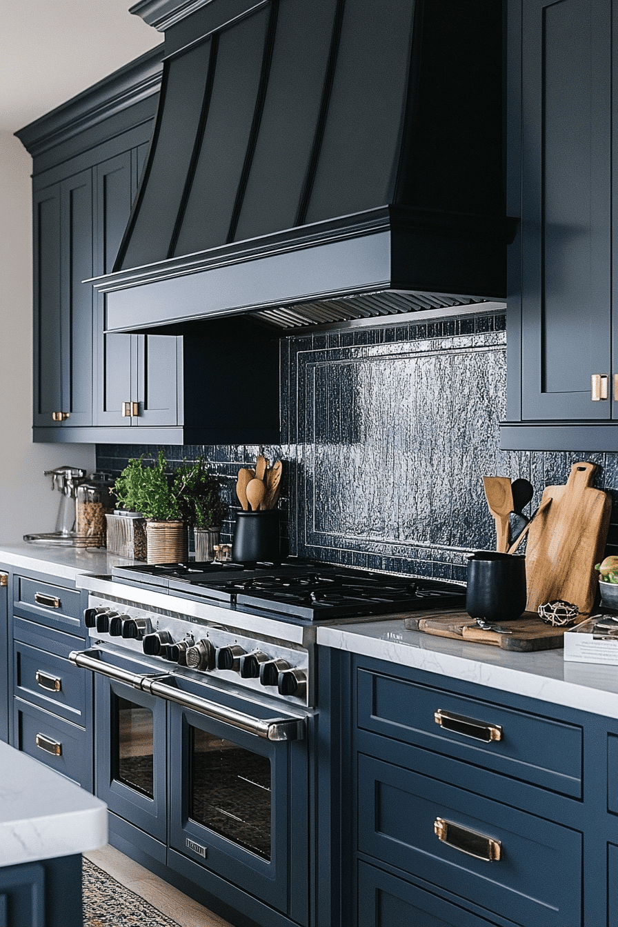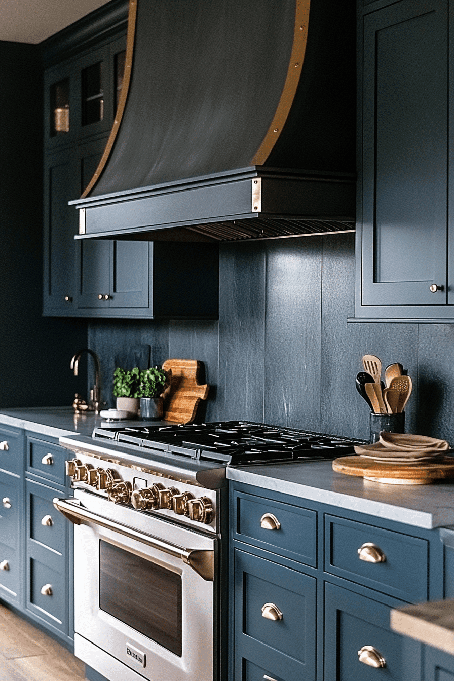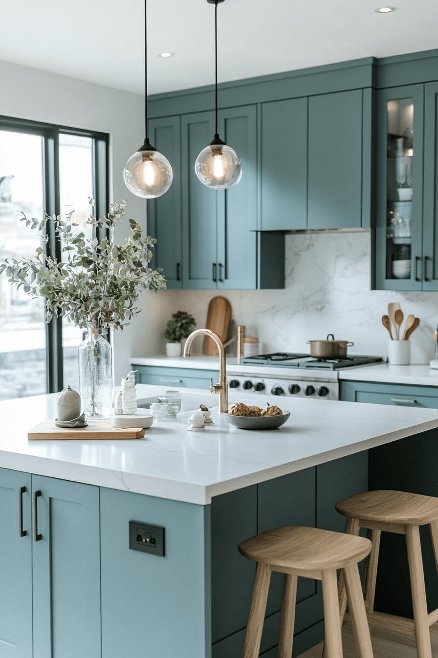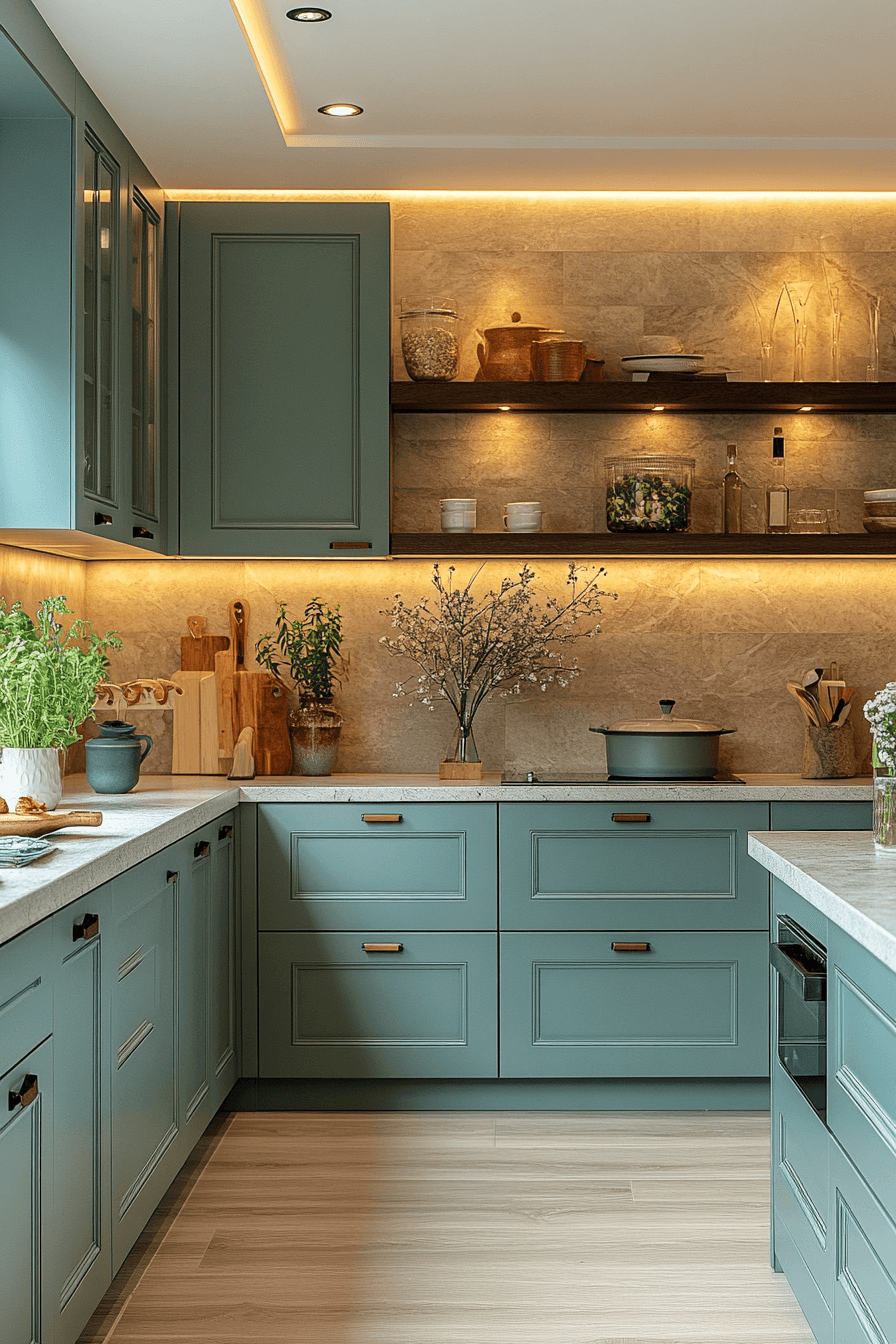 A crisp sense of sophistication appears when blue green kitchen cabinets introduce cool, composed color. Metallic finishes and marble surfaces heighten contrast. The cabinetry adds freshness while remaining upscale. Each detail feels deliberate and polished. This style suits refined modern interiors.