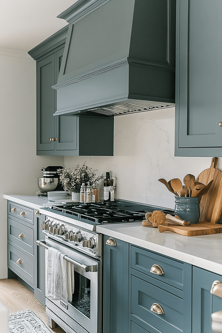 Organic movement and calm coexist when blue green kitchen cabinets lean into sage-inspired undertones. The muted tone softens architectural lines and sharp surfaces. Warm wood and subtle metal accents complement the color naturally. The result feels grounded yet sophisticated. These cabinets encourage balance and flow.