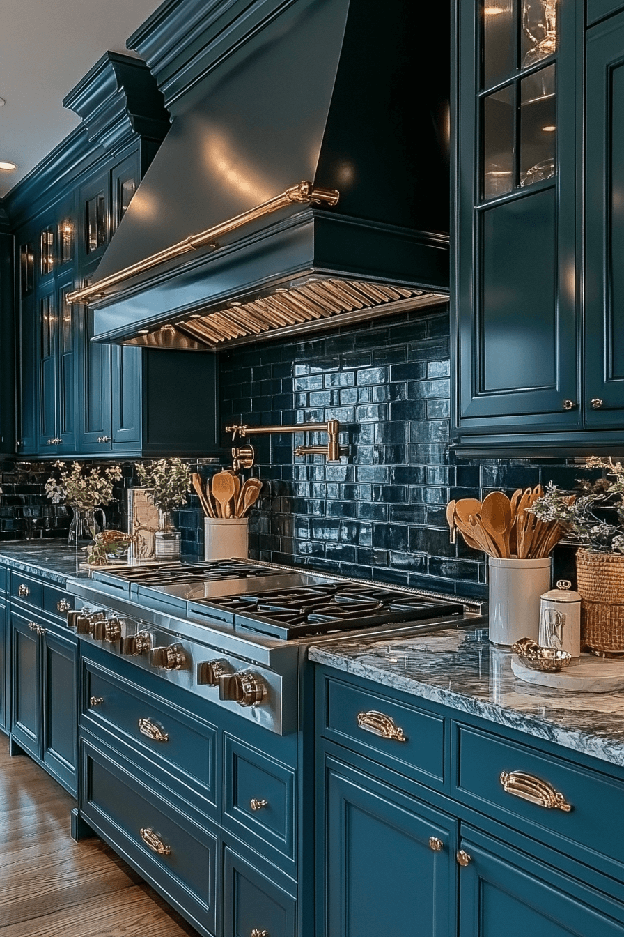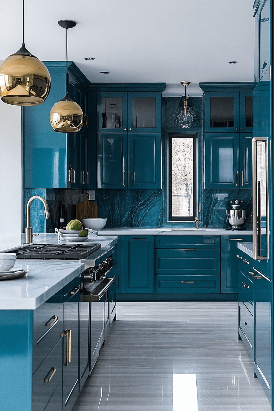 A polished sense of luxury appears when blue green kitchen cabinets introduce lagoon-inspired richness. The color brings depth while remaining crisp and refined. Gold accents and premium countertops elevate the overall aesthetic. The cabinetry adds energy without overwhelming the room. This style suits both modern and transitional spaces.