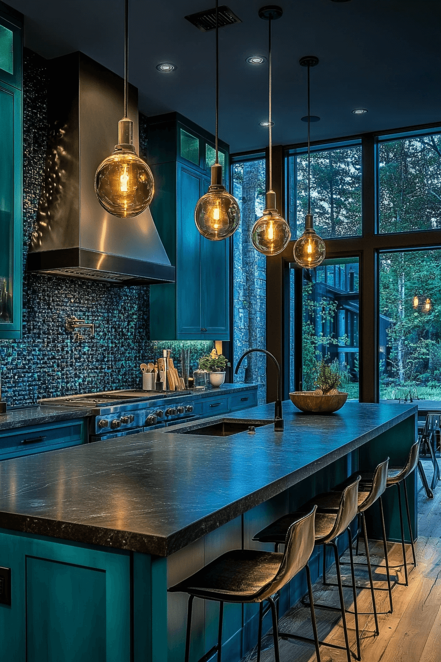Rich dimension takes center stage when blue green kitchen cabinets reflect deep ocean-inspired hues. The darker color introduces depth without overwhelming the room. Paired with matte black or brushed metal hardware, the look feels modern and grounded. These cabinets perform beautifully in both compact kitchens and open-concept layouts. The result feels dramatic yet serene.