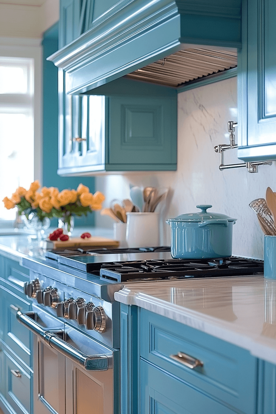 A refined sense of freshness fills the kitchen when blue green kitchen cabinets introduce a soft aqua-forward tone. The color feels crisp and calming while still delivering visual sophistication. Light countertops and clean-lined fixtures allow the cabinetry to stand out effortlessly. Subtle metallic details enhance the elegance without competing for attention. The overall mood feels airy, polished, and inviting.