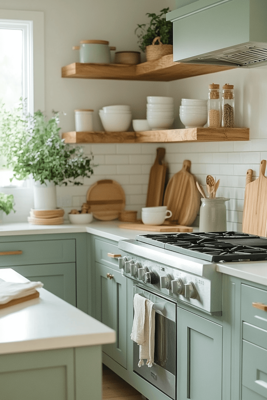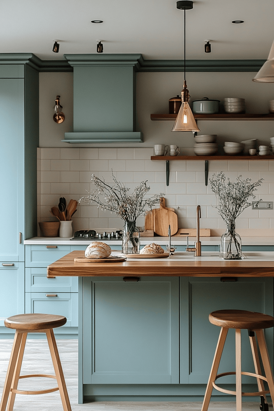 An airy, fluid mood emerges when blue green kitchen cabinets reflect water-veil inspired tones. Their softness enhances openness throughout the kitchen. Scandinavian and minimalist elements complement the palette naturally. Natural light elevates the gentle finish. The space feels balanced and serene.