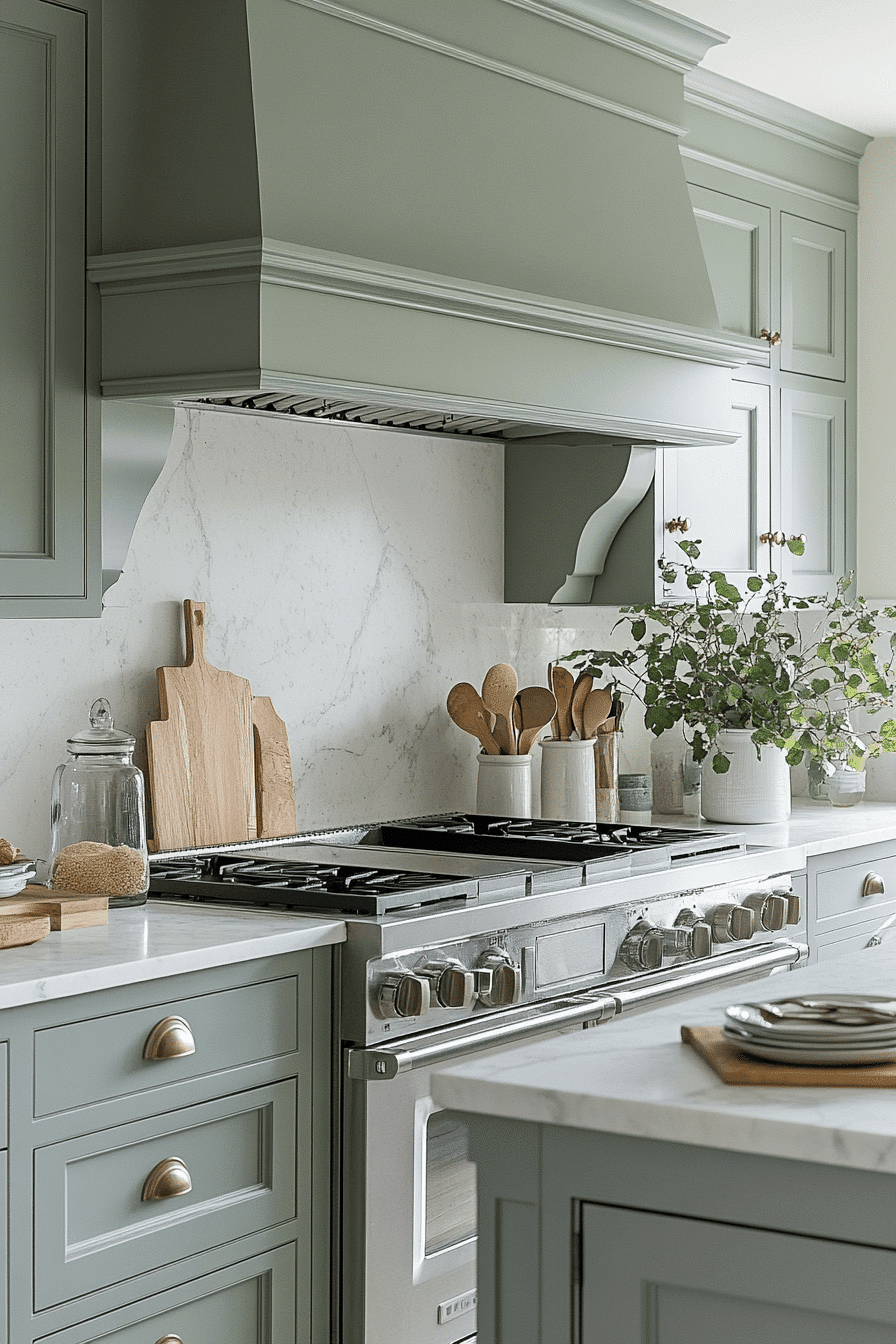 Soft refinement defines the space when blue green kitchen cabinets present tranquil, muted hues. Natural textures and pale neutrals enhance the calming effect. The look feels curated without feeling rigid. Subtle color provides depth and dimension. This palette offers ease and versatility.