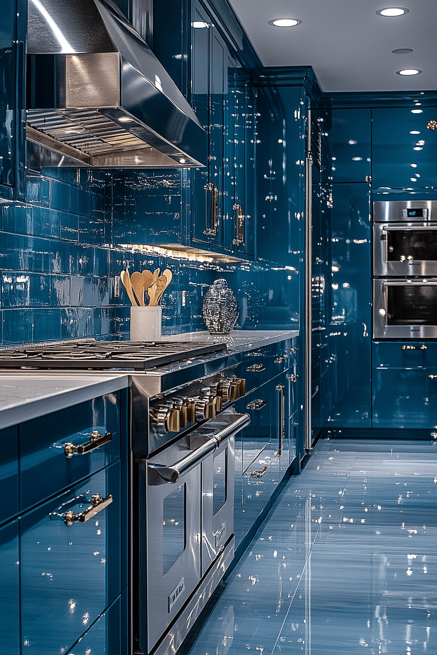Confident refinement takes shape when blue green kitchen cabinets lean into polished teal finishes. Crisp edges and reflective surfaces elevate the design. Metallic accents enhance contrast and luxury. Light plays beautifully across the cabinetry. The kitchen feels bold yet balanced.