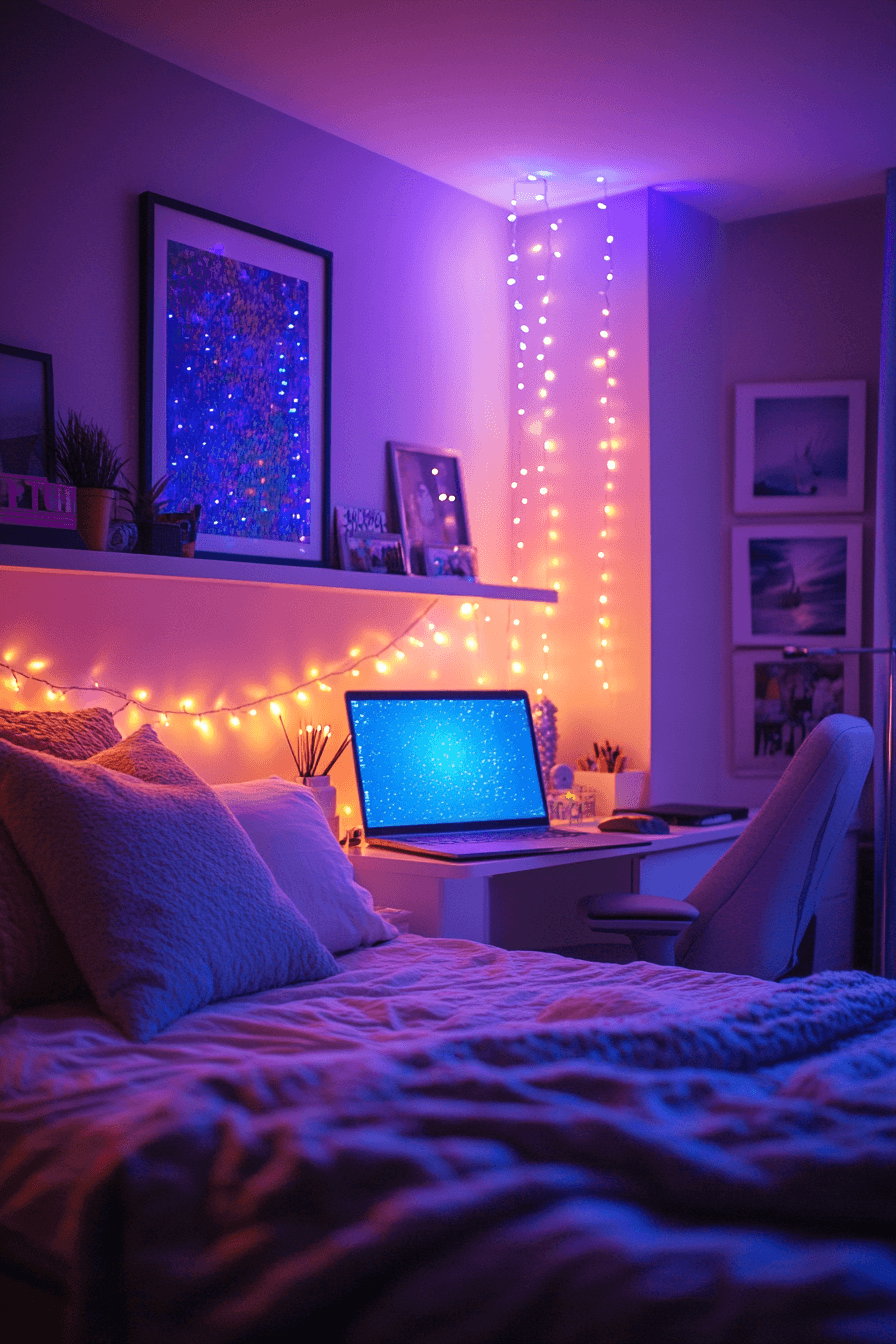 Mood lighting adds flexibility and personality to dorm spaces. Adjustable colors allow easy transitions between relaxation and study time. These college dorm room ideas create a customizable atmosphere. Minimal décor enhances the lighting effect. The room feels fun and inviting. Set your perfect vibe with more mood lighting college dorm room ideas.