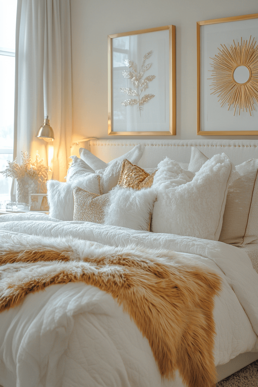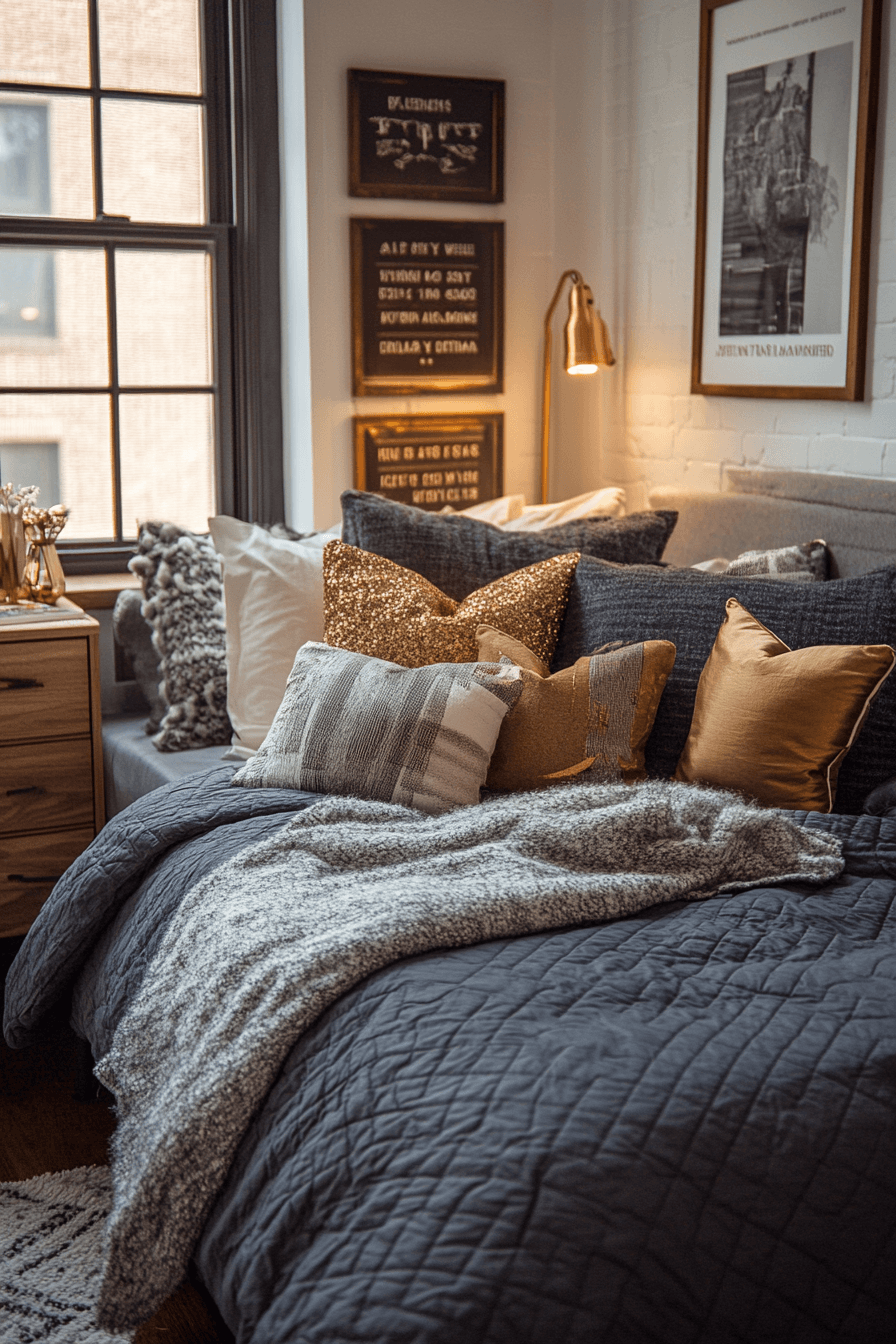 Modern glam styling brings shine and elegance into dorm rooms. Metallic accents paired with soft textures create balance. These college dorm room ideas feel chic without being overwhelming. Lighting enhances the overall effect beautifully. The result is stylish and comfortable. Discover more glam-inspired college dorm room ideas.