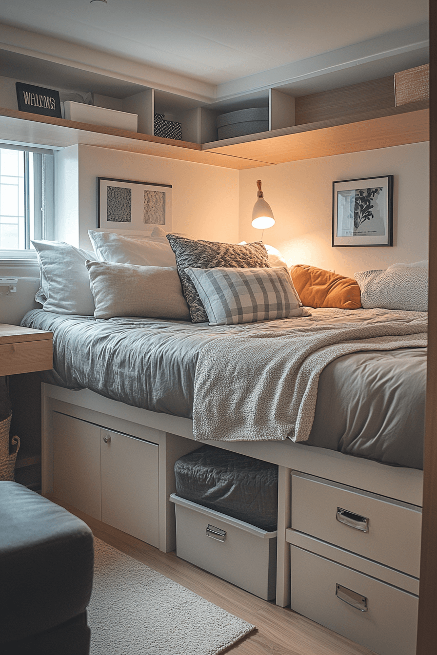 Under-bed storage keeps dorm rooms clutter-free and efficient. Hidden compartments make use of every available inch. These college dorm room ideas help maintain a tidy environment. The design stays clean and functional. It’s perfect for smaller spaces. Stay organized with more smart storage college dorm room ideas.