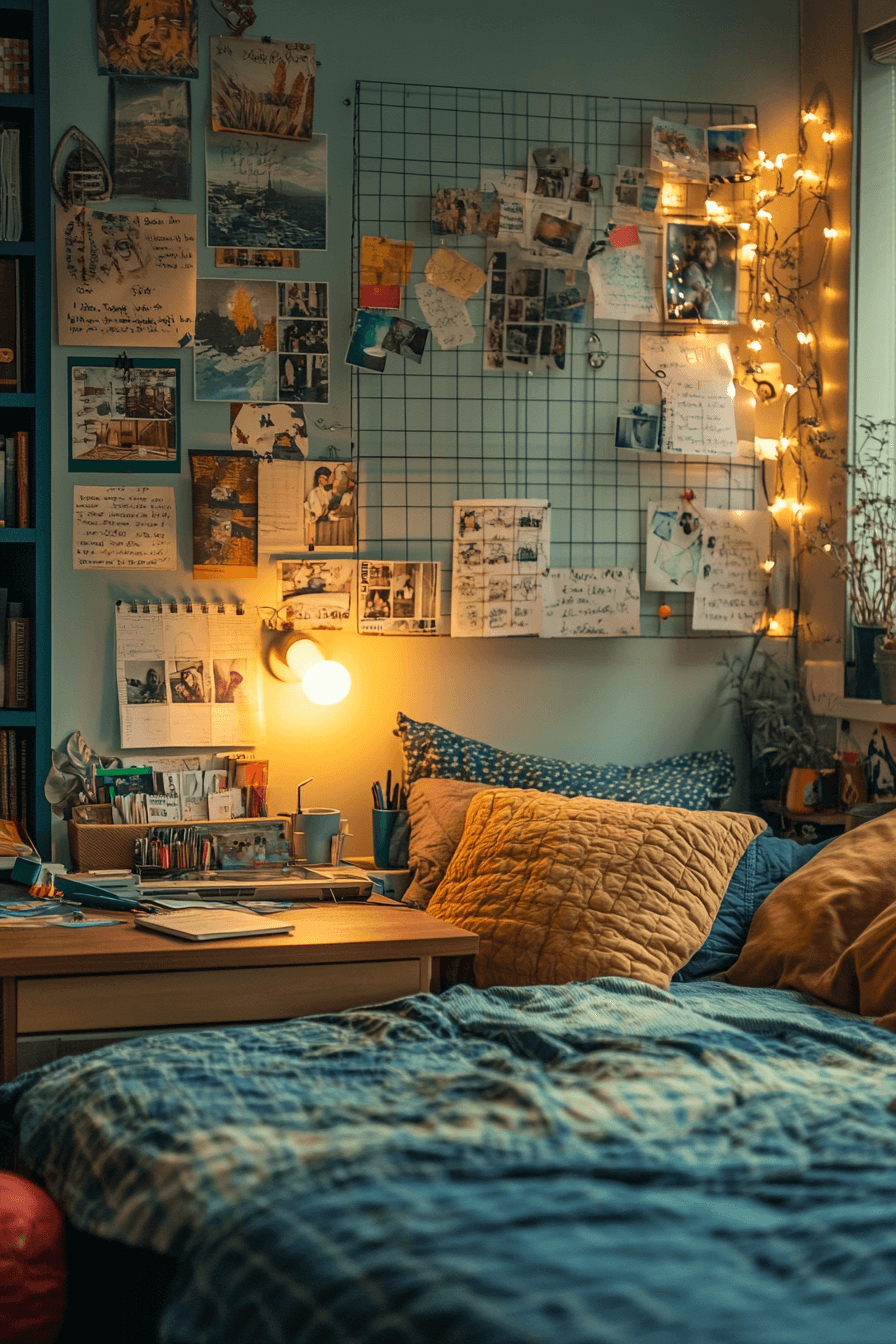 Wall organizers add both style and function to dorm study areas. Grids or boards keep notes and décor in place. These college dorm room ideas make workspaces more efficient. Pairing with good lighting boosts focus. The setup feels modern and organized. Upgrade your workspace with more functional college dorm room ideas.