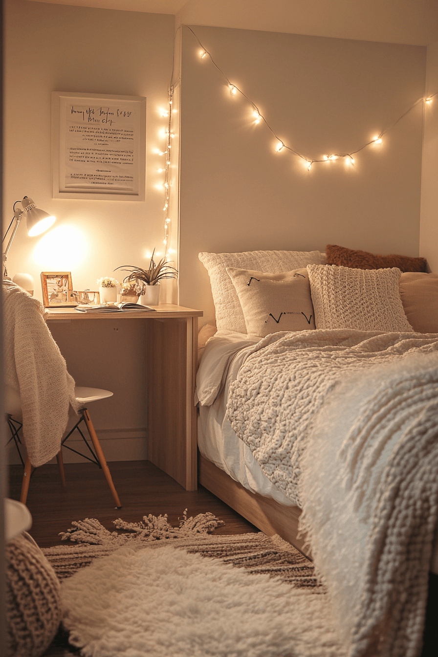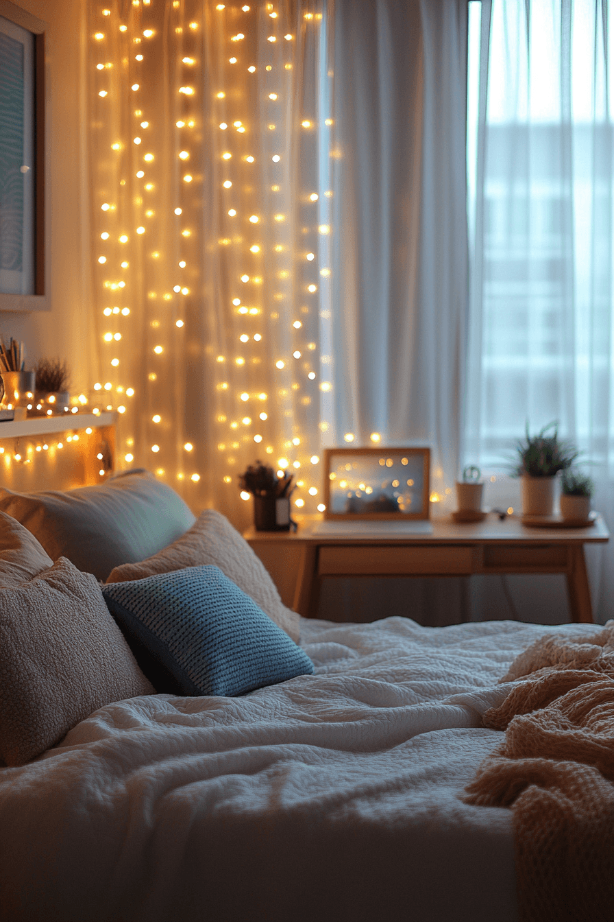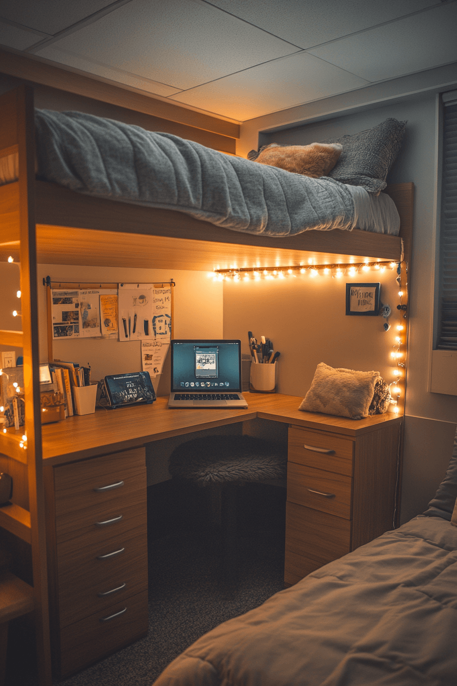 String lights create a warm and cozy glow that transforms dorm rooms instantly. Soft lighting adds charm and relaxation. These college dorm room ideas are affordable and stylish. Draping lights across walls creates a dreamy effect. The space feels magical and inviting. Create a cozy atmosphere with more lighting college dorm room ideas.