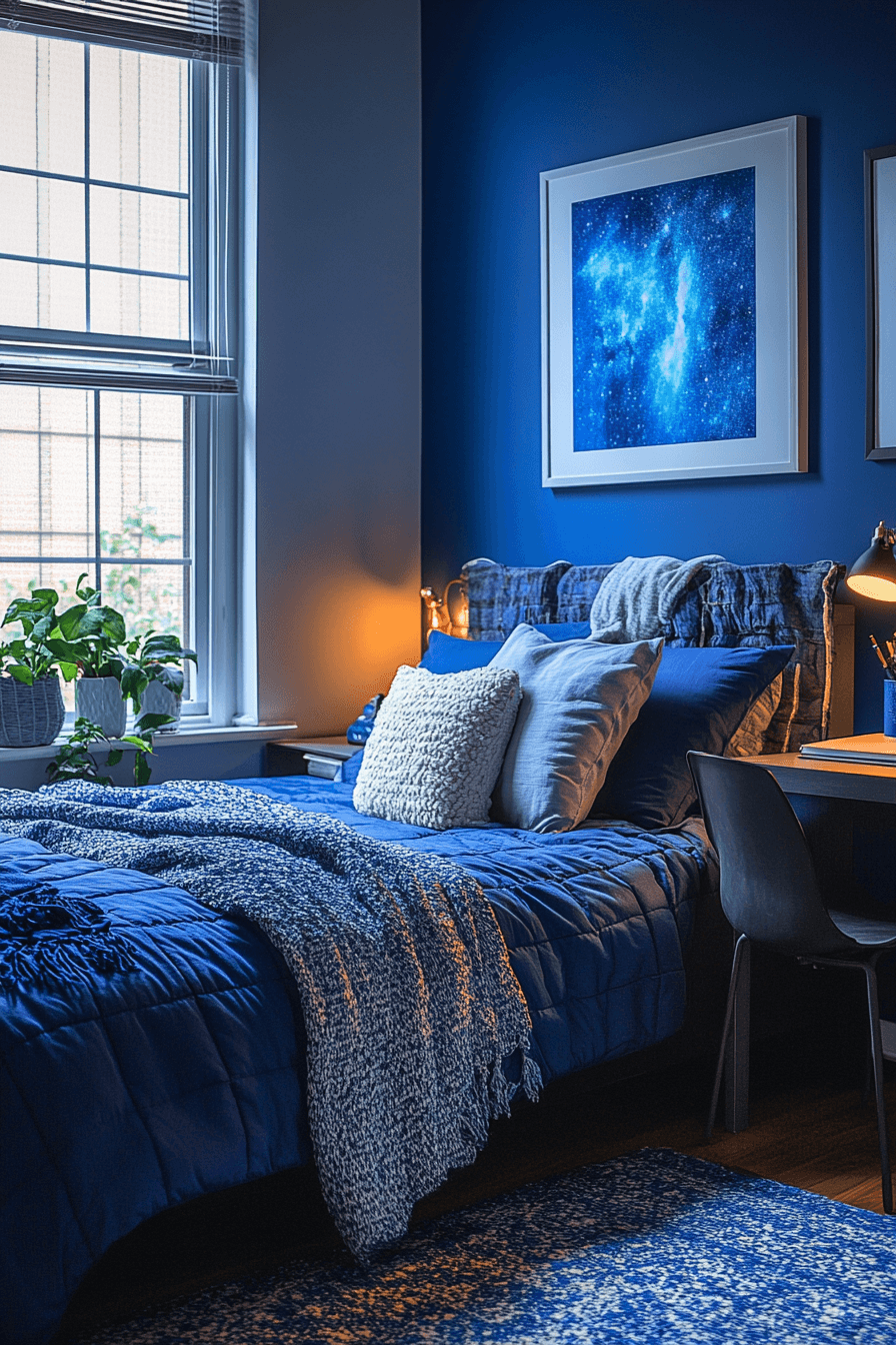Deep blue tones bring a calming and sophisticated feel to dorm décor. Rich colors paired with lighter accents create balance. These college dorm room ideas feel mature and stylish. The palette supports both focus and relaxation. It’s bold yet soothing. Explore more blue-toned college dorm room ideas.